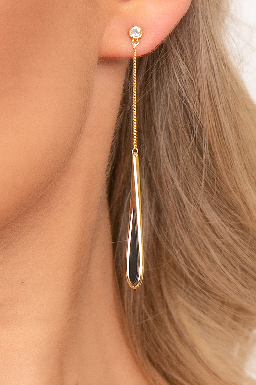 Элегантные серьги способны грамотно подчеркнуть утончённость натуры. Подойдут для создания делового или вечернего образа. Гвоздик украшен мерцающим кристаллом, продолжением которого является тонкая цепочка с продолговатой каплей на конце.