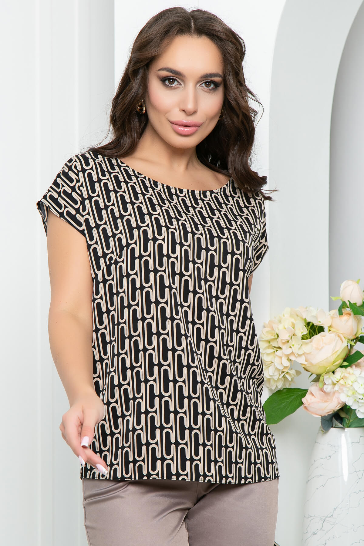 Классическая блуза прямого кроя из шелковистой ткани с принтом. Такая модель гармонично впишется в деловой гардероб. Рукав цельнокроеный.