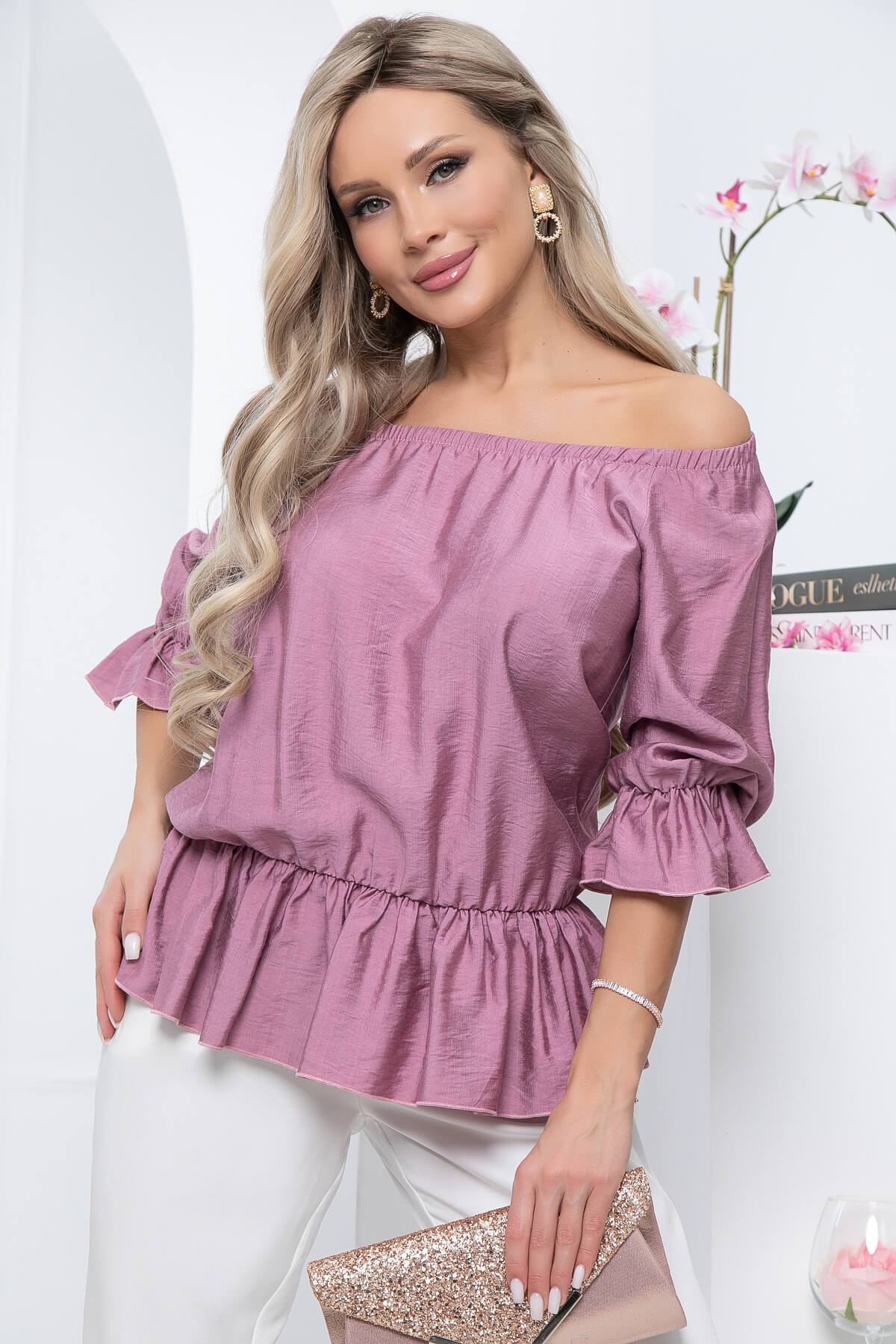 Блуза в модном оттенке - это отличная возможность проявить свою женственность. Рукав три четверти, по низу украшен воланом. Само изделие так же украшено по низу воланом, что придает образу легкости и воздушности. Горловина отработана резинкой, это позволяет спустить блузу на плечи, что придаст образу кокетства. Отлично будет смотреться как с брюками, так и с джинсами.