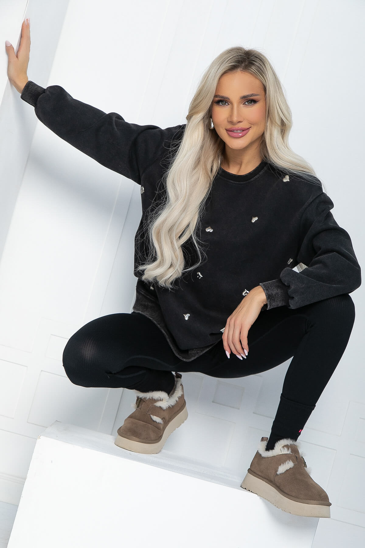 Джемпер в чёрном оттенке с эффектом «варёной» ткани обладает свободным кроем, что обеспечивает комфорт и свободу движений. Декоративные сердечки придают ему игривость и романтичность. Идеально сочетается с джинсами, леггинсами или юбками, позволяя создавать разнообразные образы как для прогулок по городу, так и для вечерних встреч с друзьями. В сочетании с кедами или уютными ботинками он станет основой лёгкого и стильного образа.