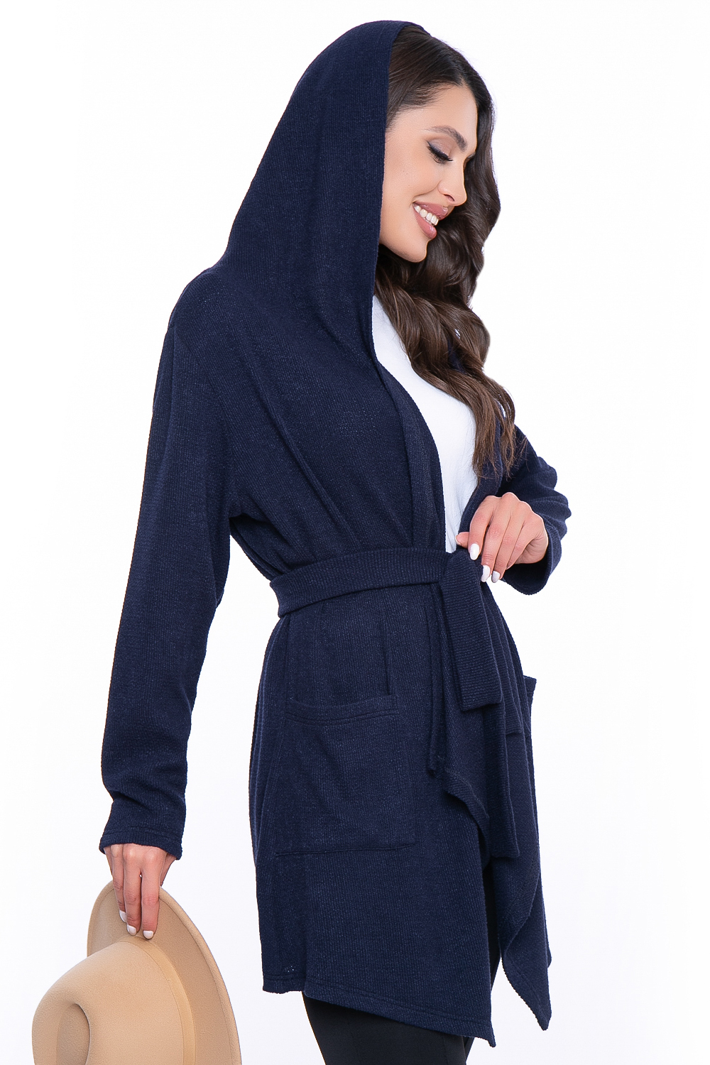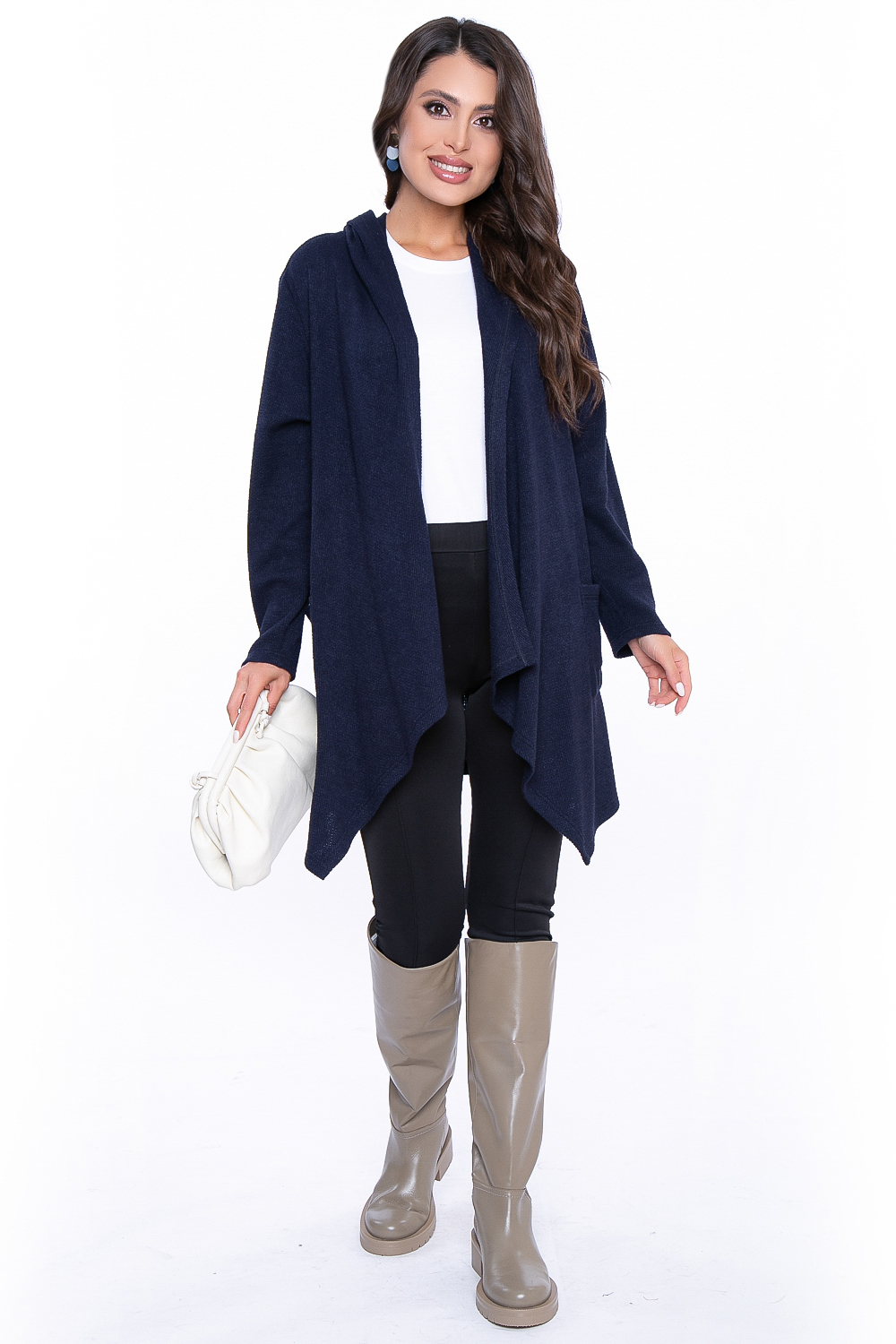 - Трикотажный кардиган с шалевым воротником-капюшоном;