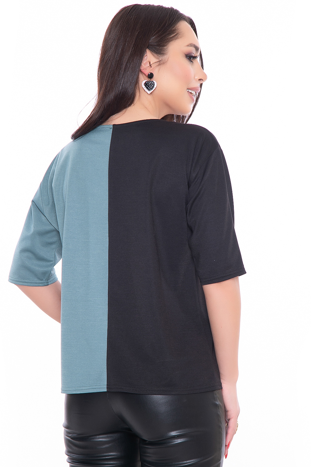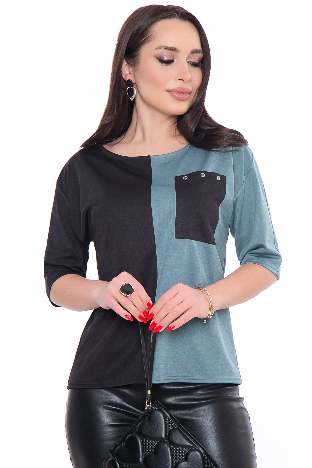 Трикотажный джемпер на каждый день, состоящий их двух контрастных половинок. Джемпер из мягкого трикотажа, классический округлый вырез горловины, плечевой шов спущен, рукав укороченный, втачной, три четверти. На груди накладной кармашек с люверсами.