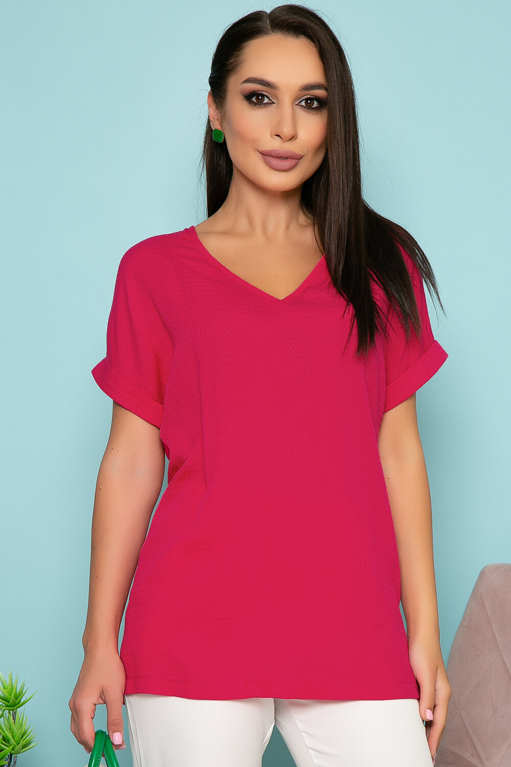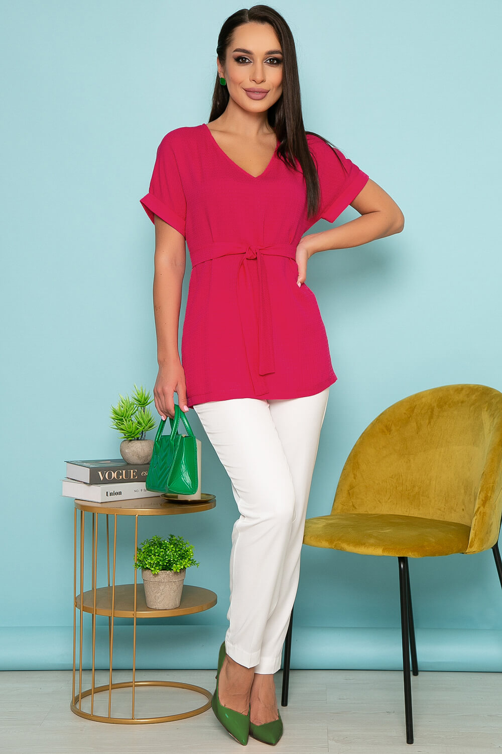 Блуза из хлопка с коротким рукавом в невероятном оттенке "Фуксия" с поясом из основной ткани. Блуза свободного силуэта, линия плеча спущена, на манжете. V-образный вырез горловины, без подкладки, низ ровный. Примерьте на себя яркие краски этого лета!