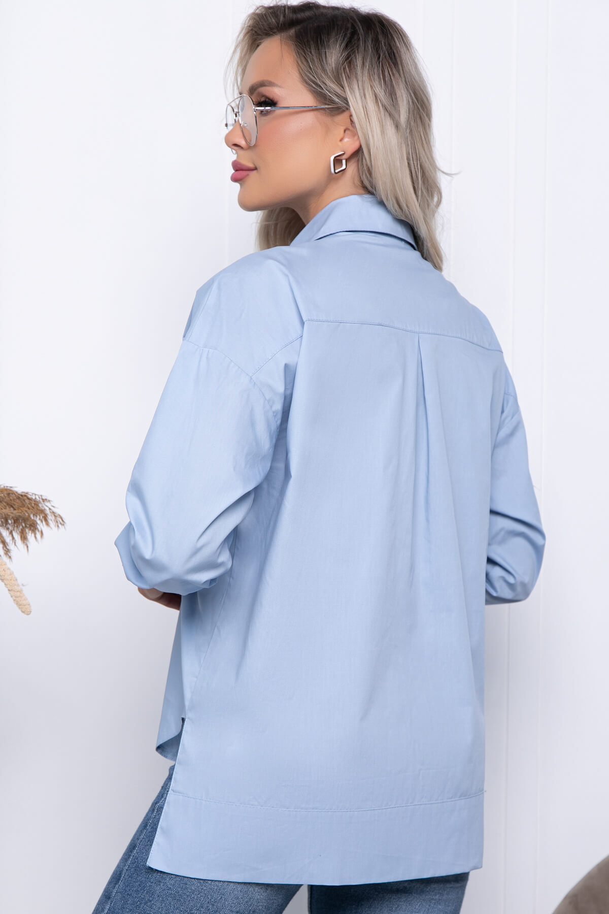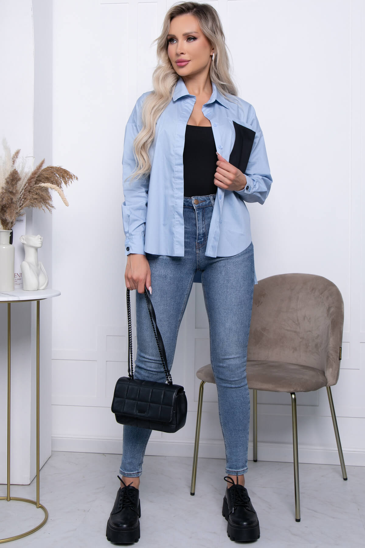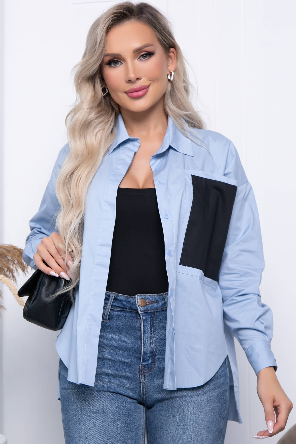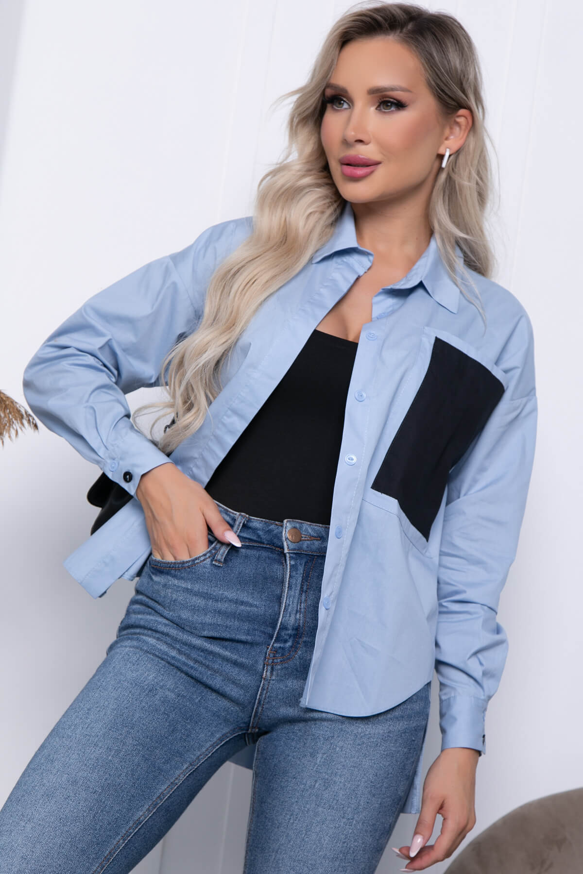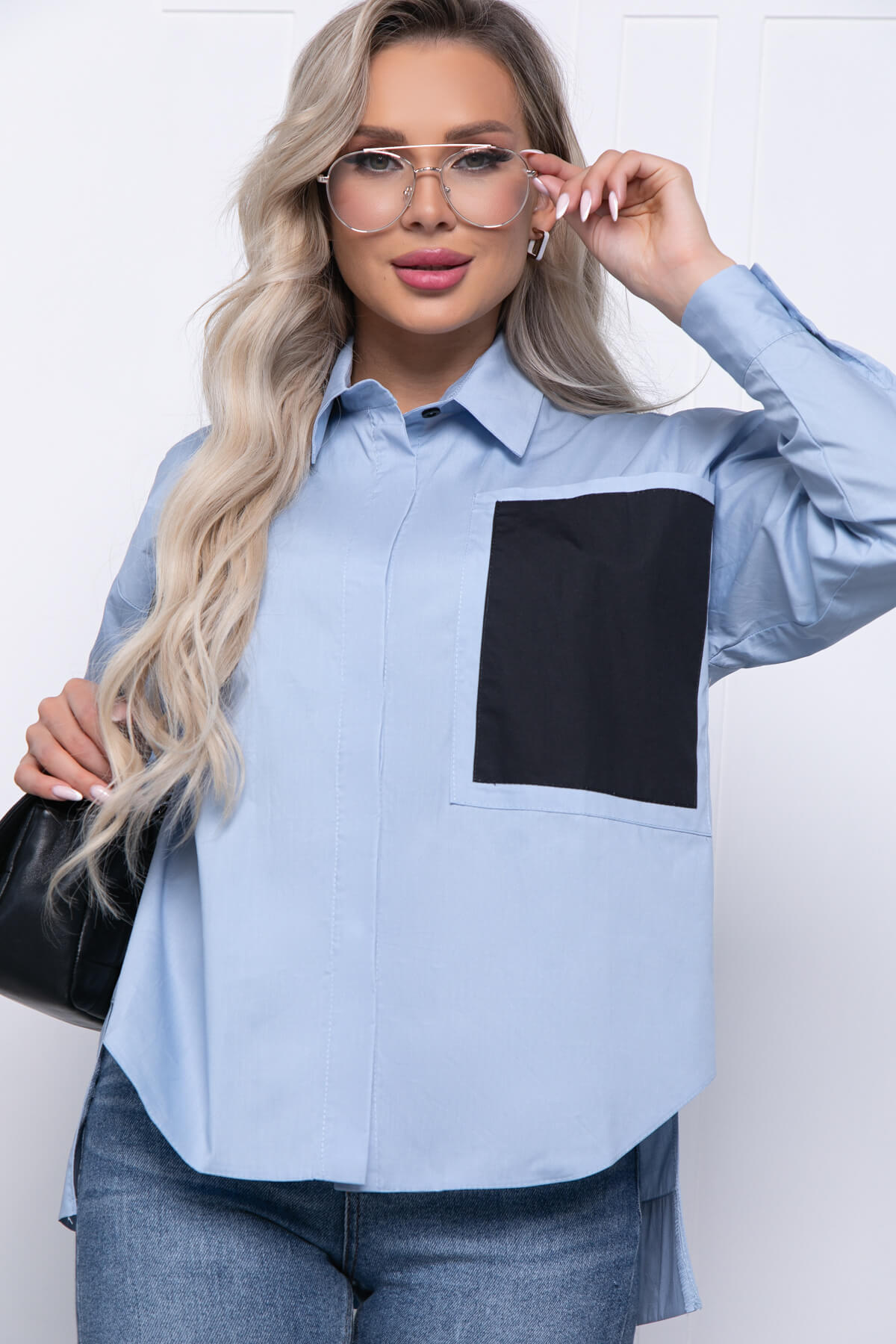 Рубашка, как базовая вещь, отлично дополнит любой образ: офисный, деловой или повседневный. Может стать частью многослойного образа или изюминкой комплекта с брюками или джинсами. Рубашка свободного кроя, по переду притачная планка и супатная застёжка, спинка удлинена, низ ассиметричный. На груди есть накладной контрастный карман. Рукав втачной, длинный, на манжете. По спинке - кокетка.