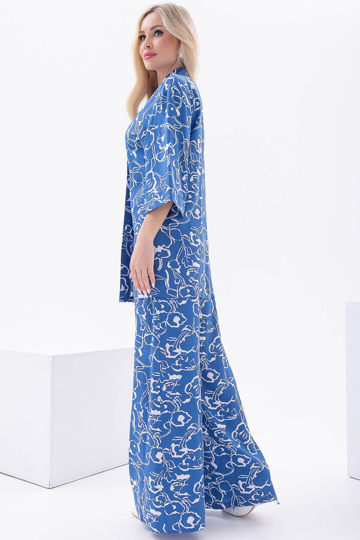Костюм из лёгкой ткани идеально подойдёт для летнего расслабленного образа. Свободный крой не сковывает движений и дарит комфорт. Рукав укороченный со спущенным плечевым швом.В комплект входит пояс из основной ткани, который позволит подчеркнуть преимущества фигуры.