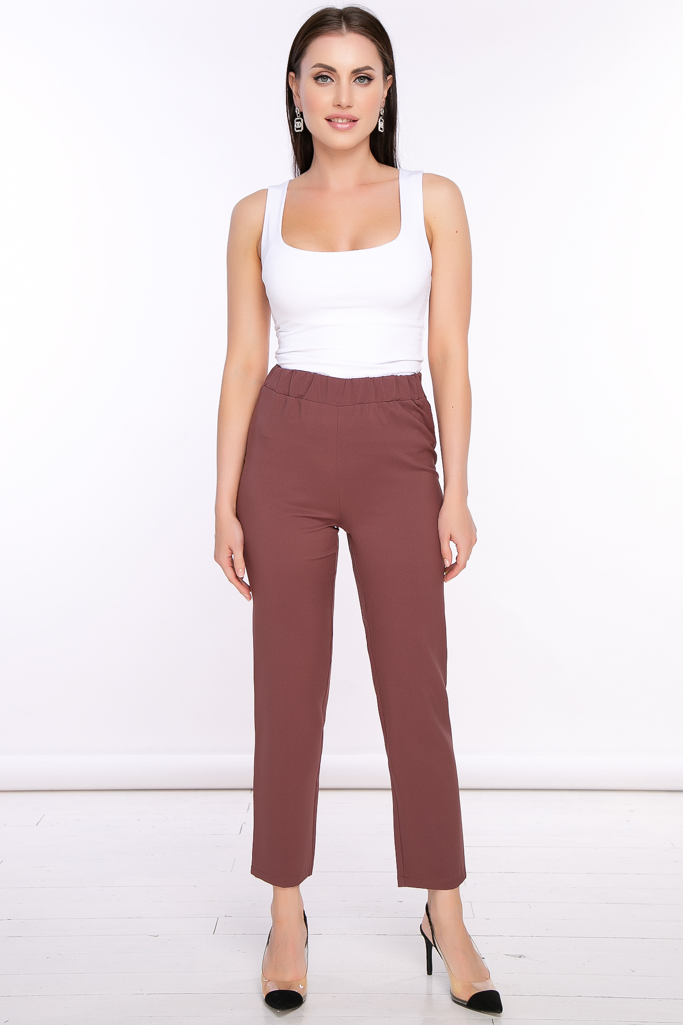 - Брюки из легкой ткани, талия на резинке, прямого кроя;