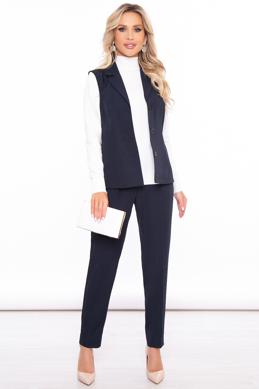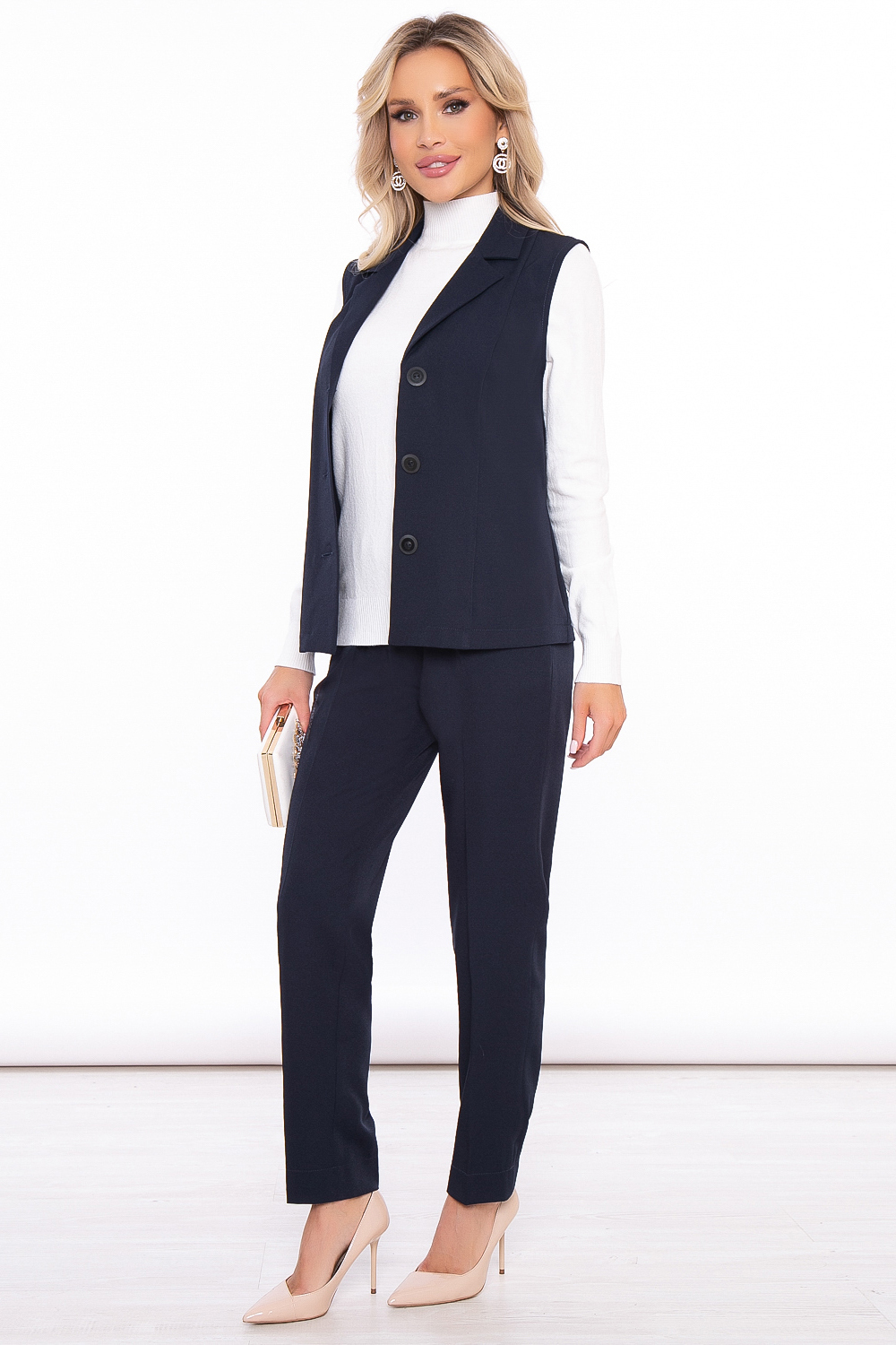 Костюм из двух предметов - брюк и жилета идеально подойдет для офисных будней, а так же для деловых и официальных мероприятий. Костюм с легкостью создаёт красивый деловой образ, его можно сочетать с блузой, водолазкой или джемпером.