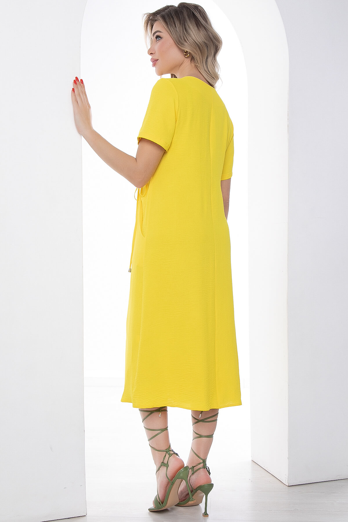 Яркое летнее платье длиной миди — отличный выбор, если вы ищете расслабленный, но в то же время стильный наряд. Желтый цвет даёт интересные комбинации в сочетании с другими оттенками. Изделие с кулиской под грудью, можно завязывать банты. Рукав укороченный, втачной. Спереди есть два потайных кармана.