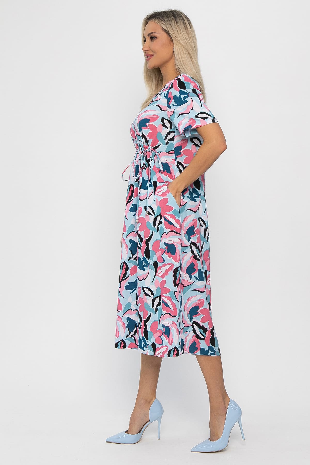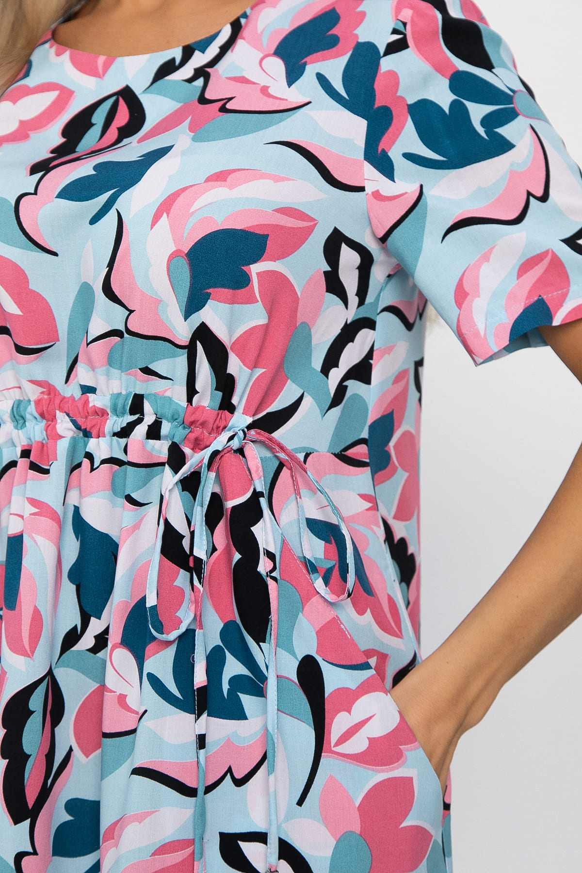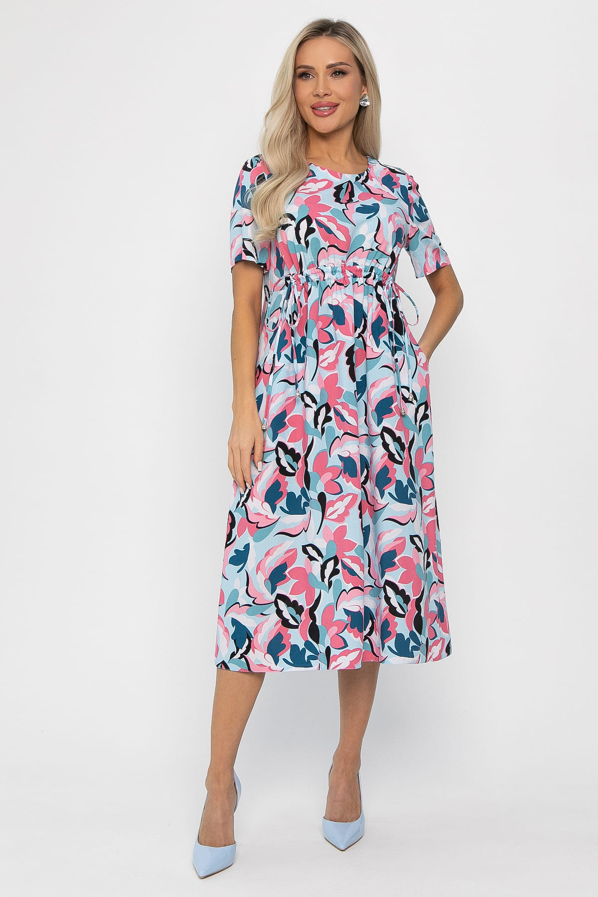 Платье средней длины, выполненное в голубо-розовом цвете, станет отличным выбором для создания расслабленного и стильного летнего образа. Спереди декоративный элемент в виде кулиски под грудью, который затягивается на шнурки. Рукав втачной, укороченный. На передней части изделия расположены два потайных кармана.