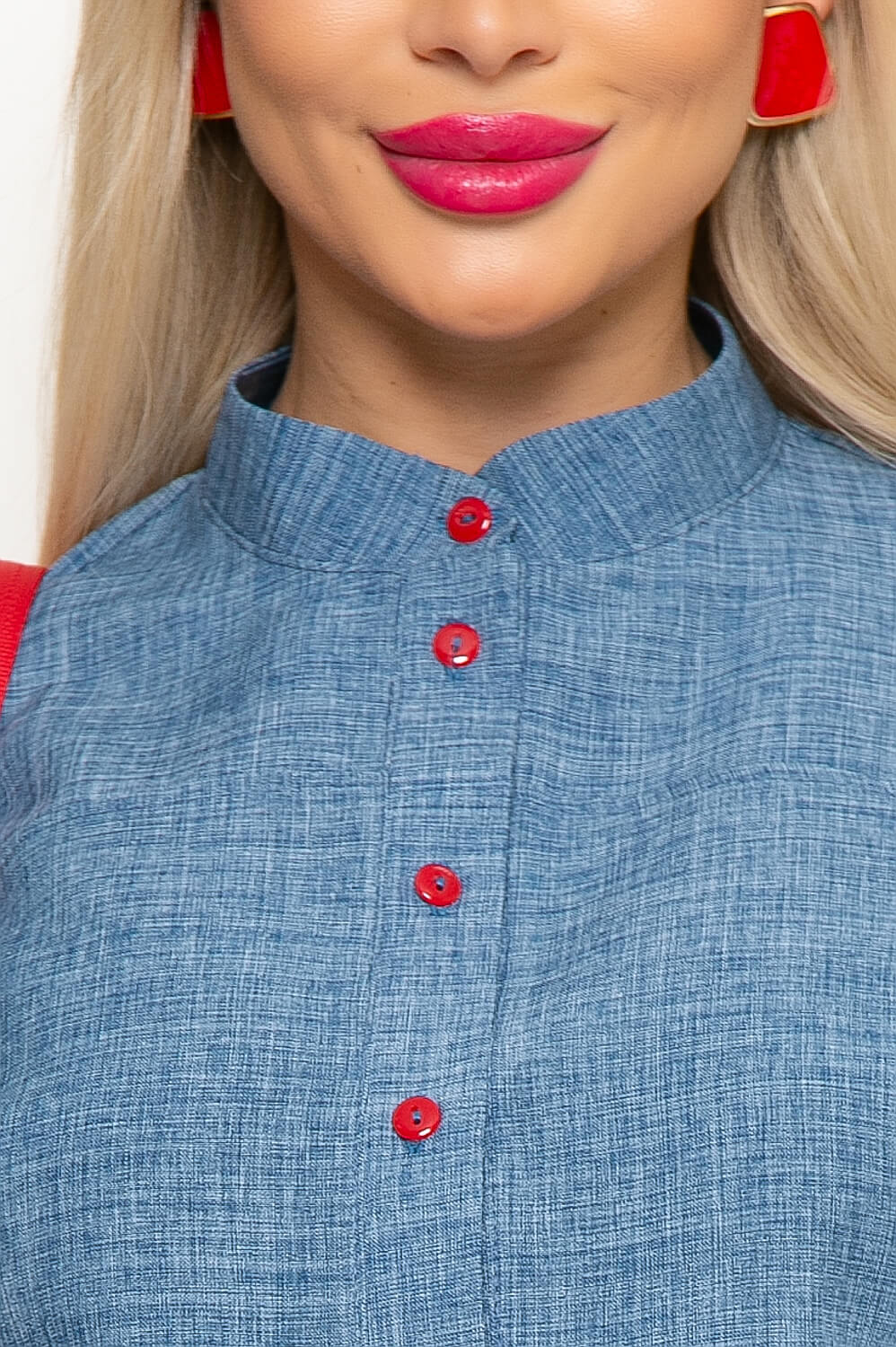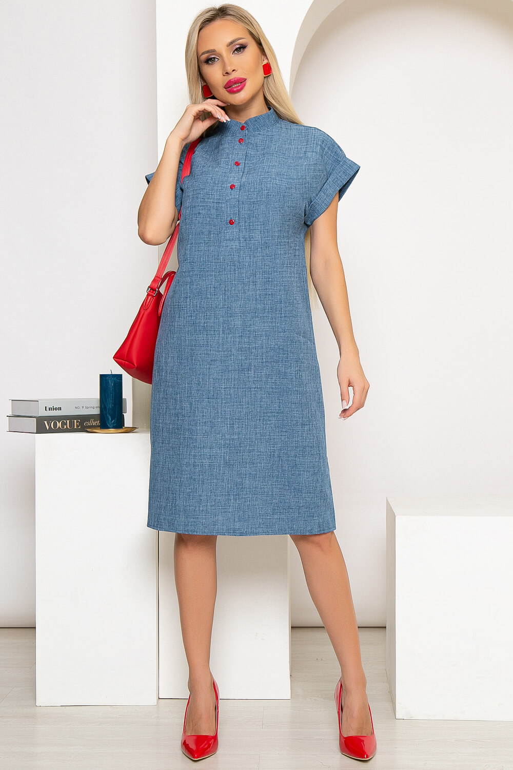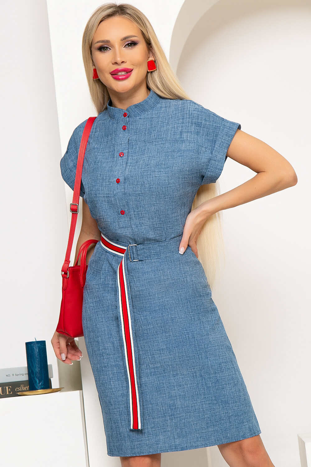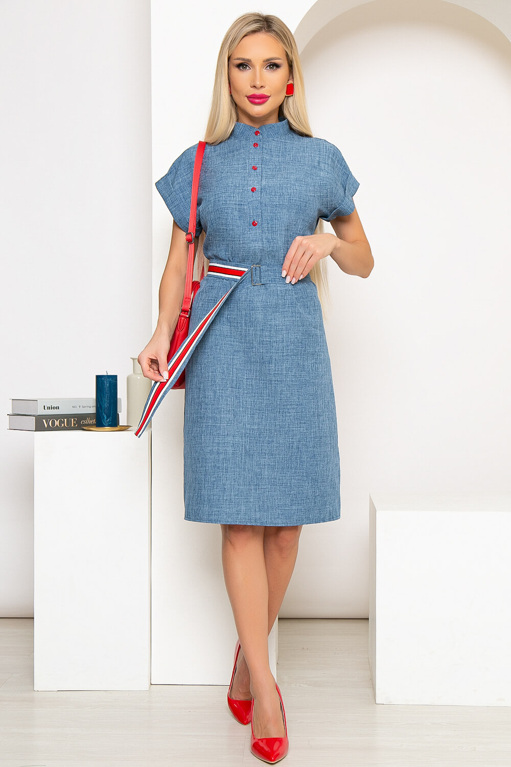 Платье на каждый день с акцентным поясом практично и неприхотливо к выбору аксессуаров. Можно сочетать с туфлями на каблуке или кедами. Платье прямого кроя, горловина оформлена стойкой, по переду застёгивается на функциональные пуговицы. Рукав цельнокроенный, короткий, с отворотом. По низу платья по бокам есть разрезы. В комплекте пояс с металлической пряжкой.
