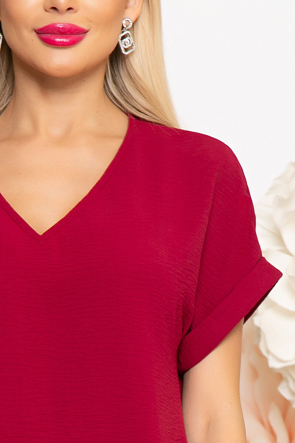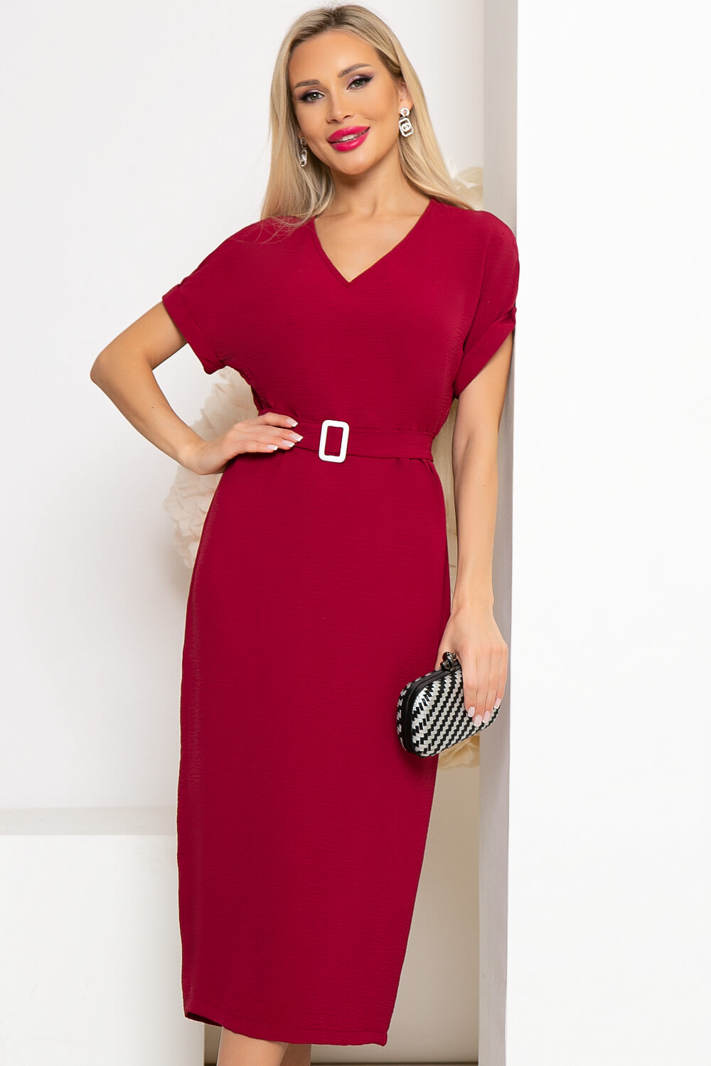 Невероятно женственное платье прямого кроя длины миди в дорогом бордовом оттенке. Платье создано без лишних деталей и в этом его прелесть! Это просто образец лаконичности. Прекрасно подойдёт для стильных повседневных образов, а также может стать главным элементом праздничного или вечернего, достаточно лишь дополнить образ подходящими аксессуарами и обувью. Платье прямого кроя, разрезное по спинке. Сзади разрез для комфортного шага. V-образный вырез горловины, безусловно, дополняет и украшает образ. Рукав короткий, цельнокроенный с отворотом. В комплект входит пояс из основной ткани с пряжкой.