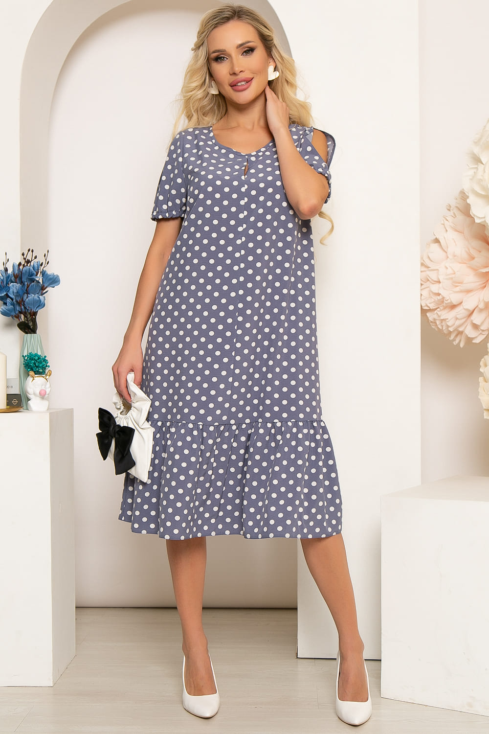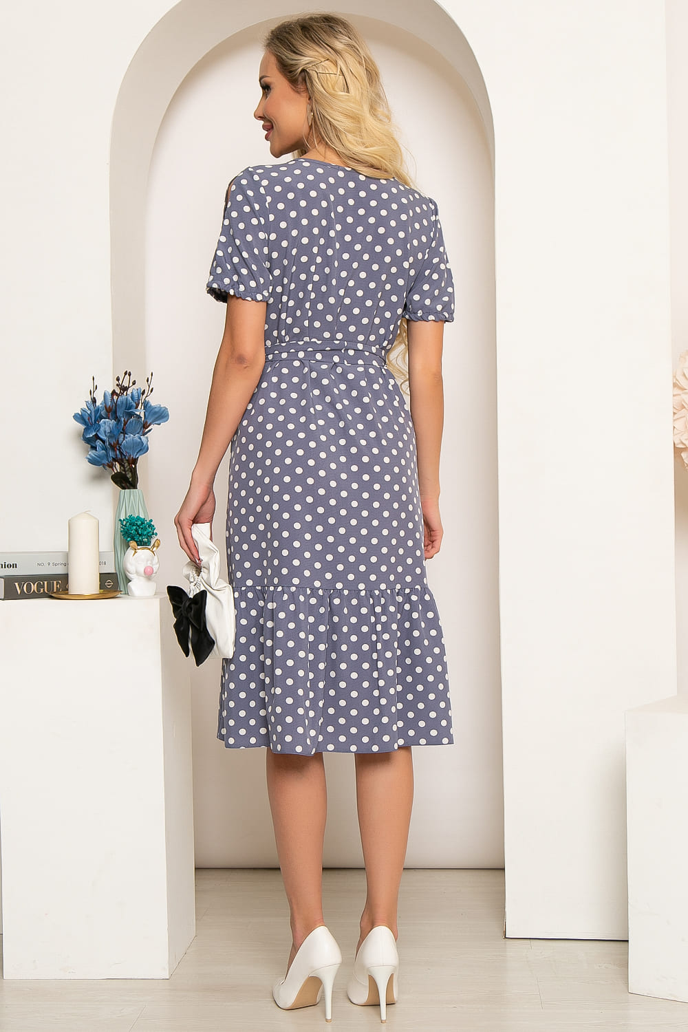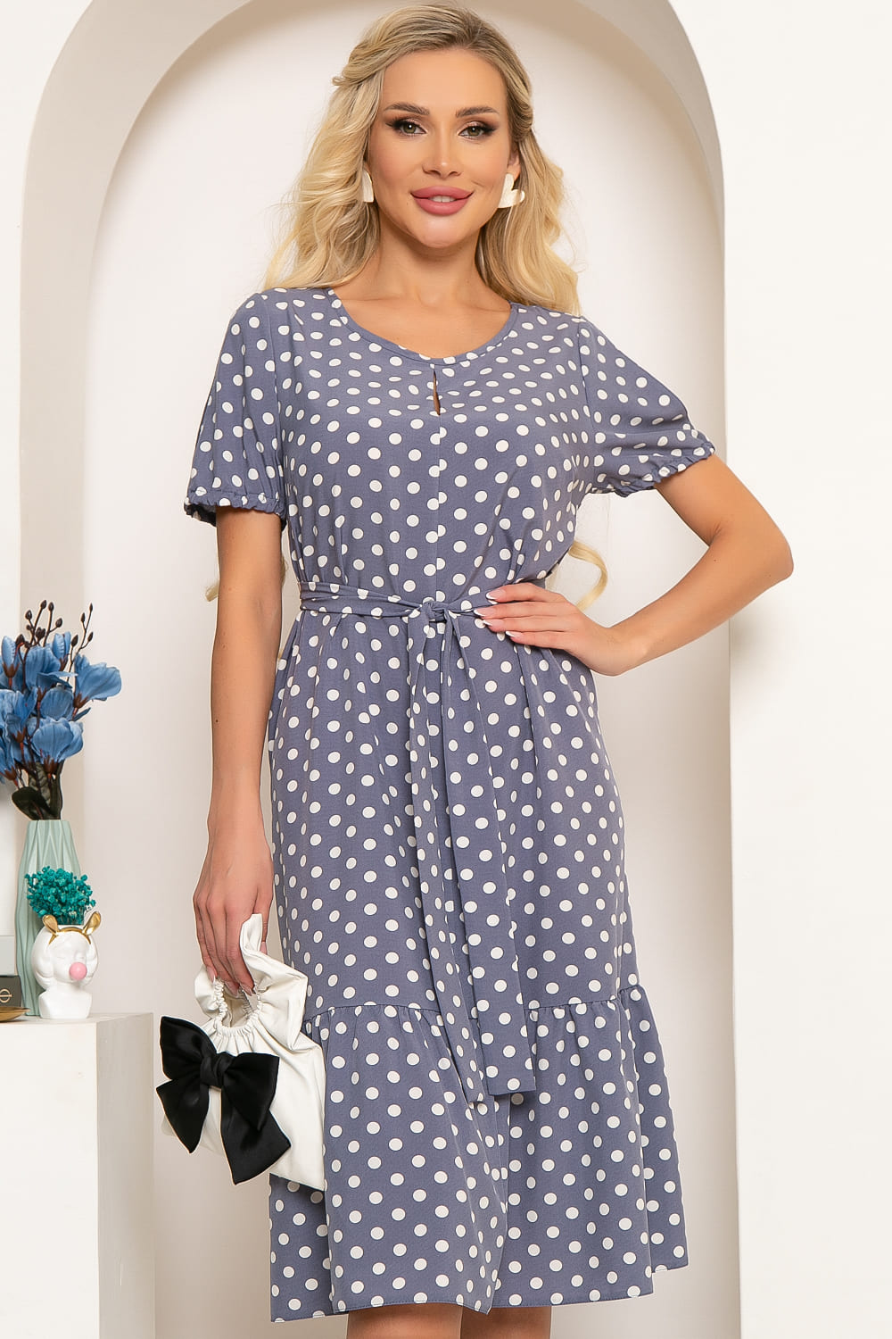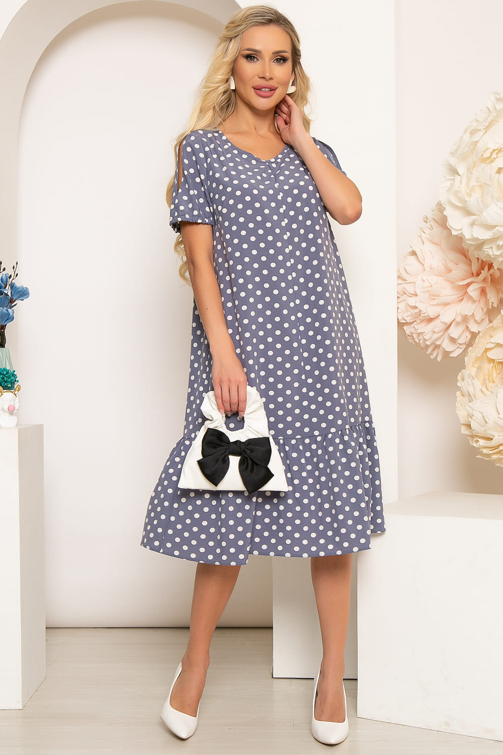 Платье свободного кроя в модном джинсовом оттенке с принтом "Горошек". Изумительно смотрится как с каблучком, так и с кедами! Юбка с воланом по низу добавляет романтичности и воздушности образу. Рукав украшен разрезом, вырез горловины- мягкий V-образный, также украшен небольшим разрезом. В комплекте пояс из основной ткани.