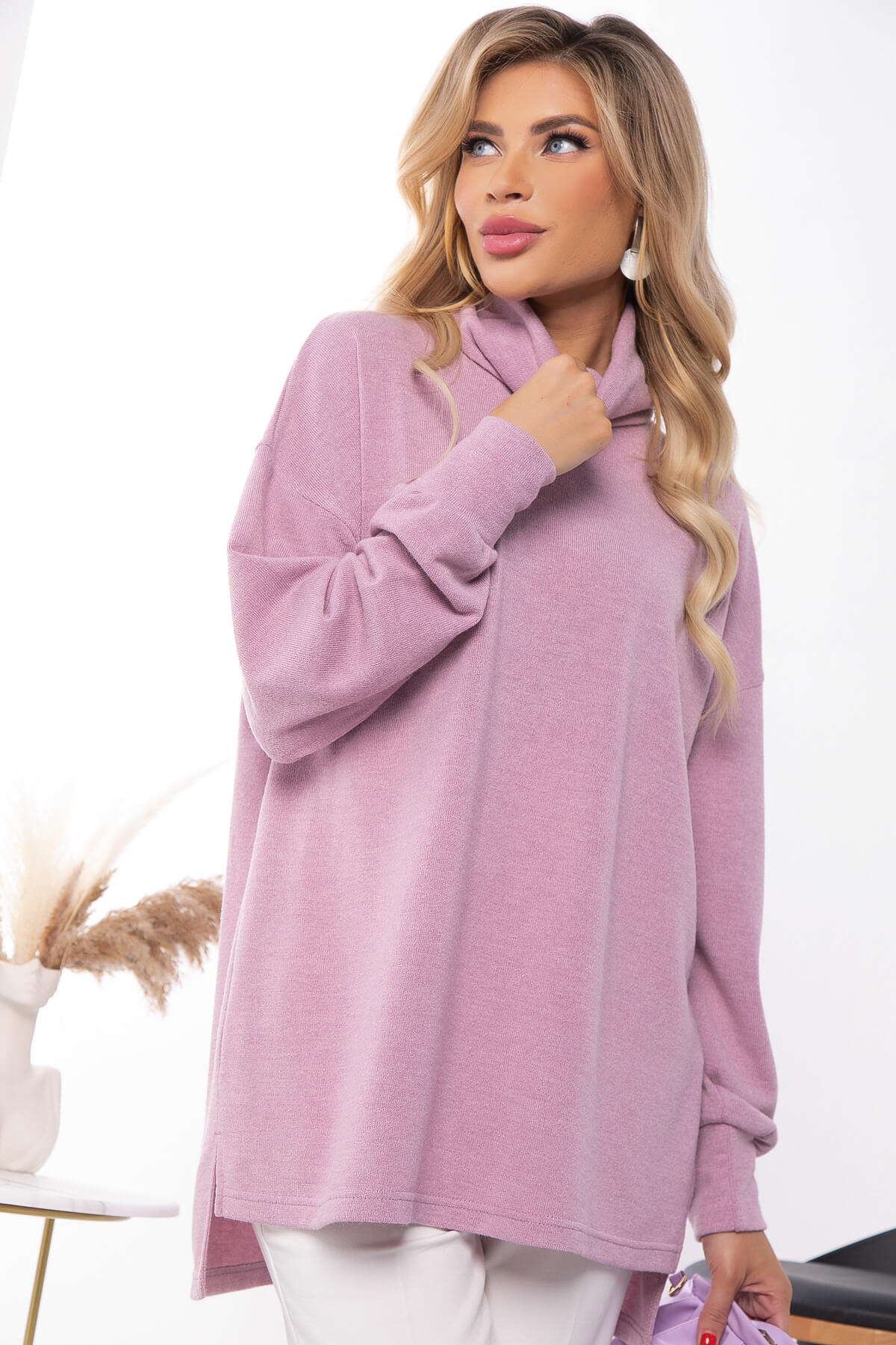 Горловина оформлена воротником "Хомут". По бокам джемпера есть разрезы.