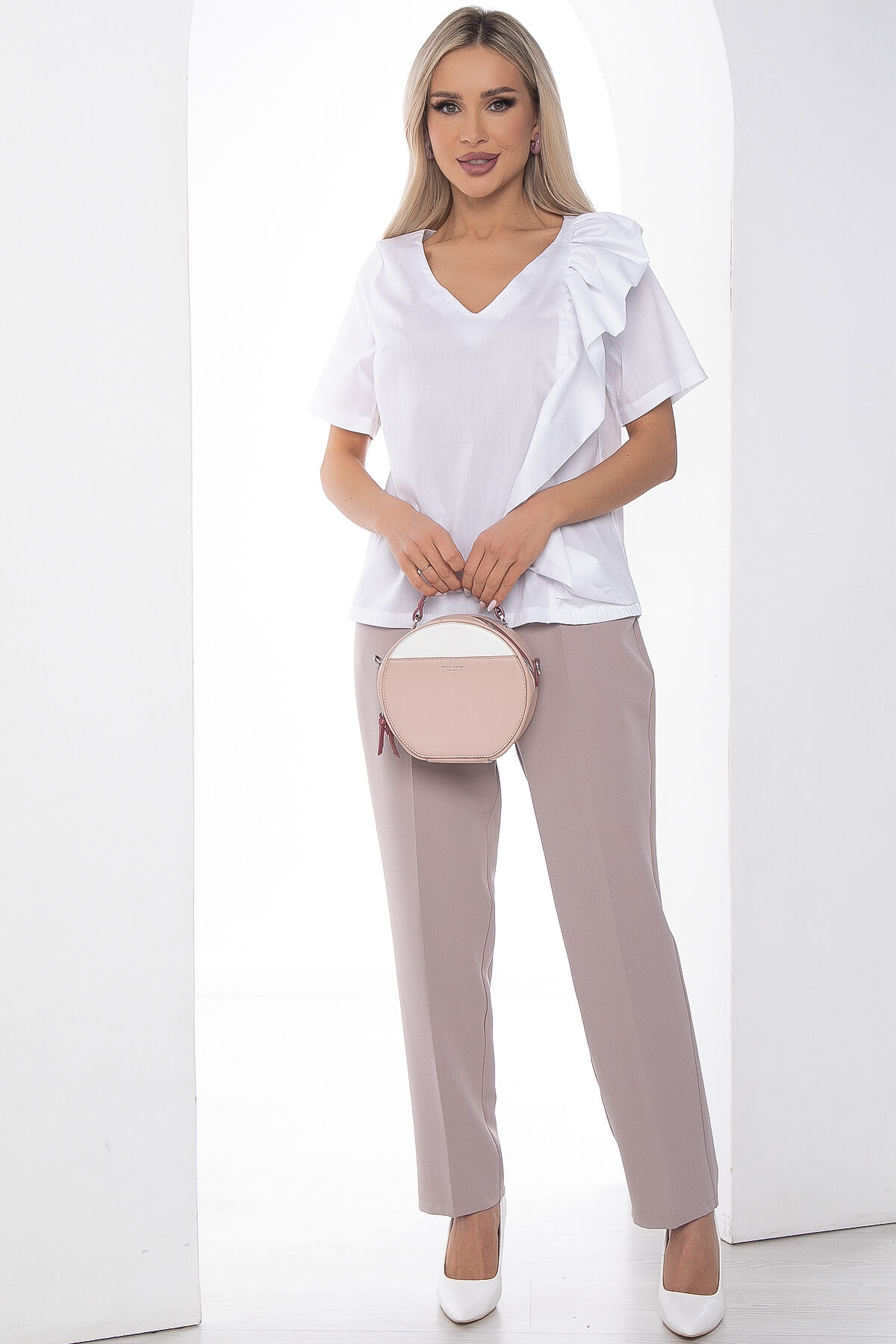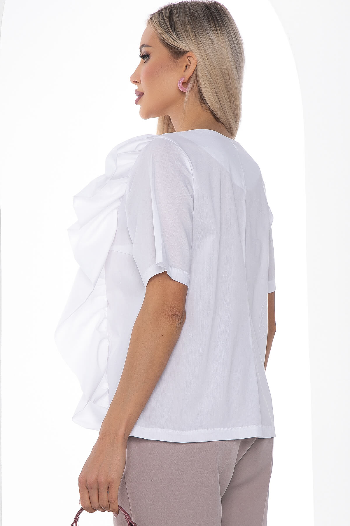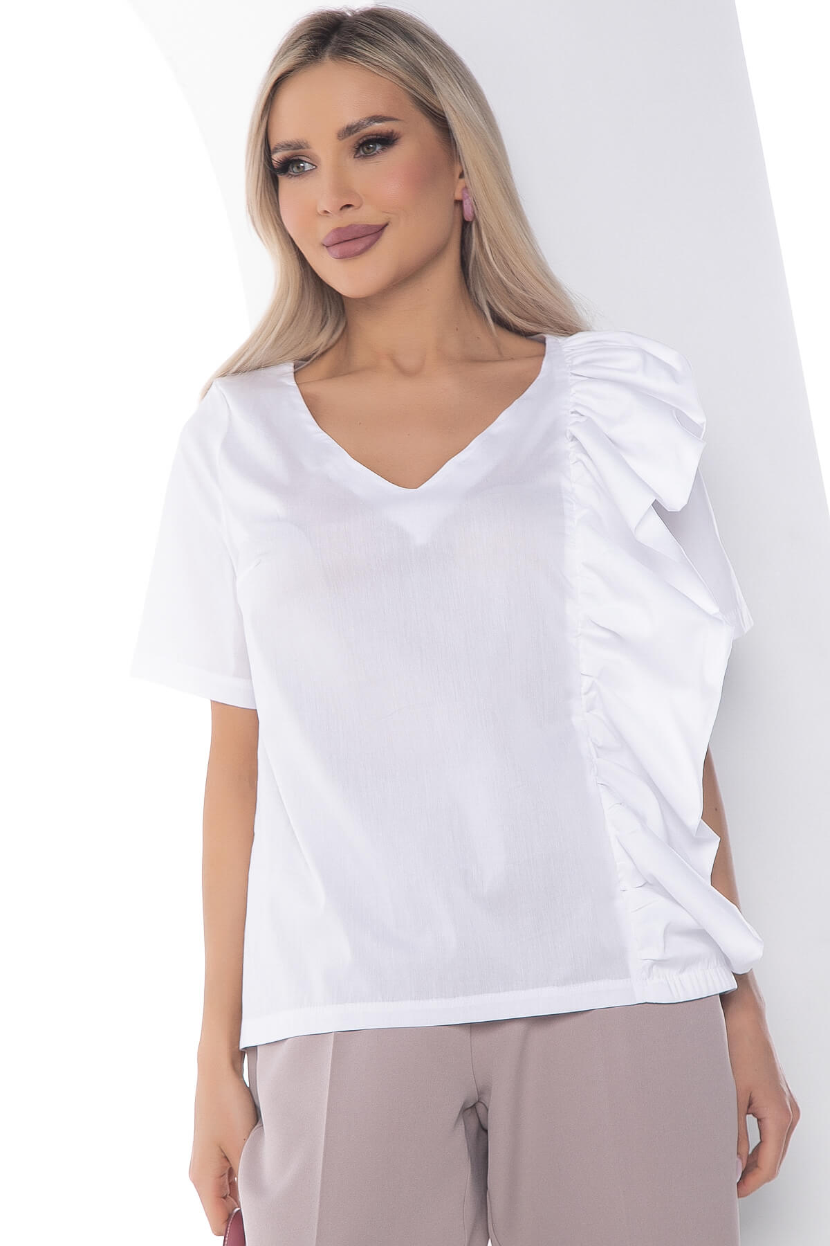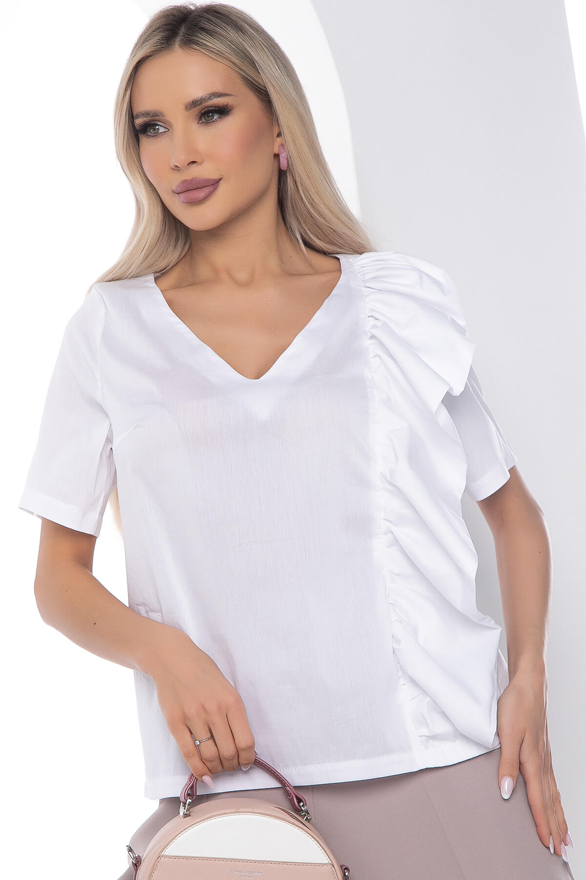 Женская блузка среднего объема с воланом по переду полуприлегающего силуэта, V-образный вырез горловины переда, короткий втачной рукав. Без подклада.