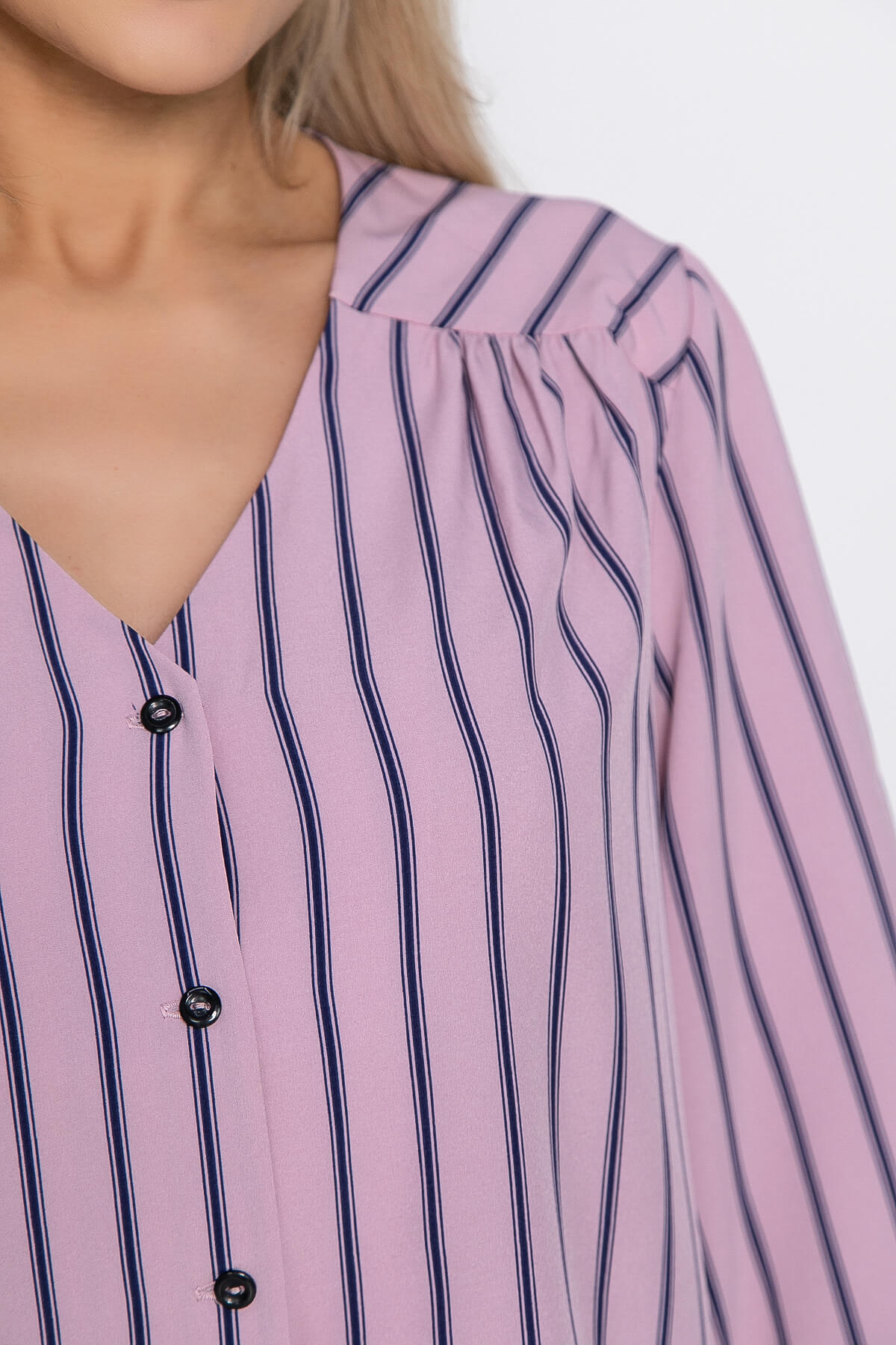 Модель с V-образным вырезом придает образу особый шарм и элегантность. Блуза будет удобна как офисная демисезонная одежда под пиджак или как летняя для повседневной носки. Имеется кокетка с лёгкими складками для идеальной посадки по плечам.