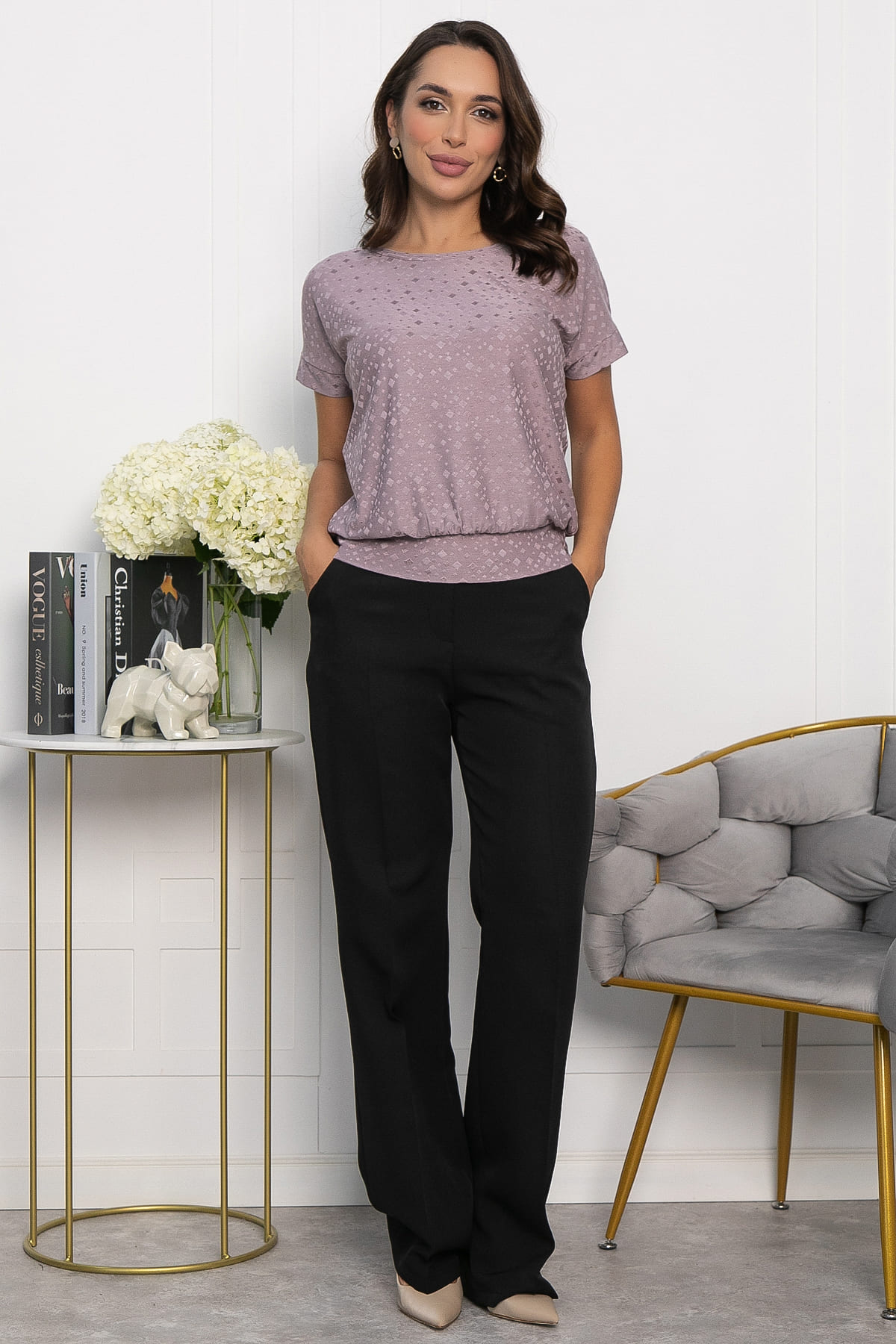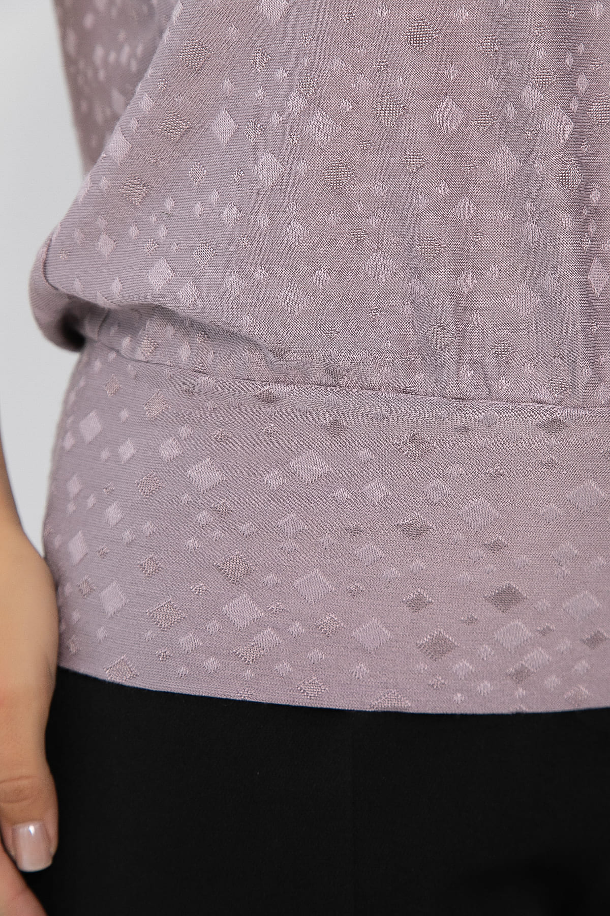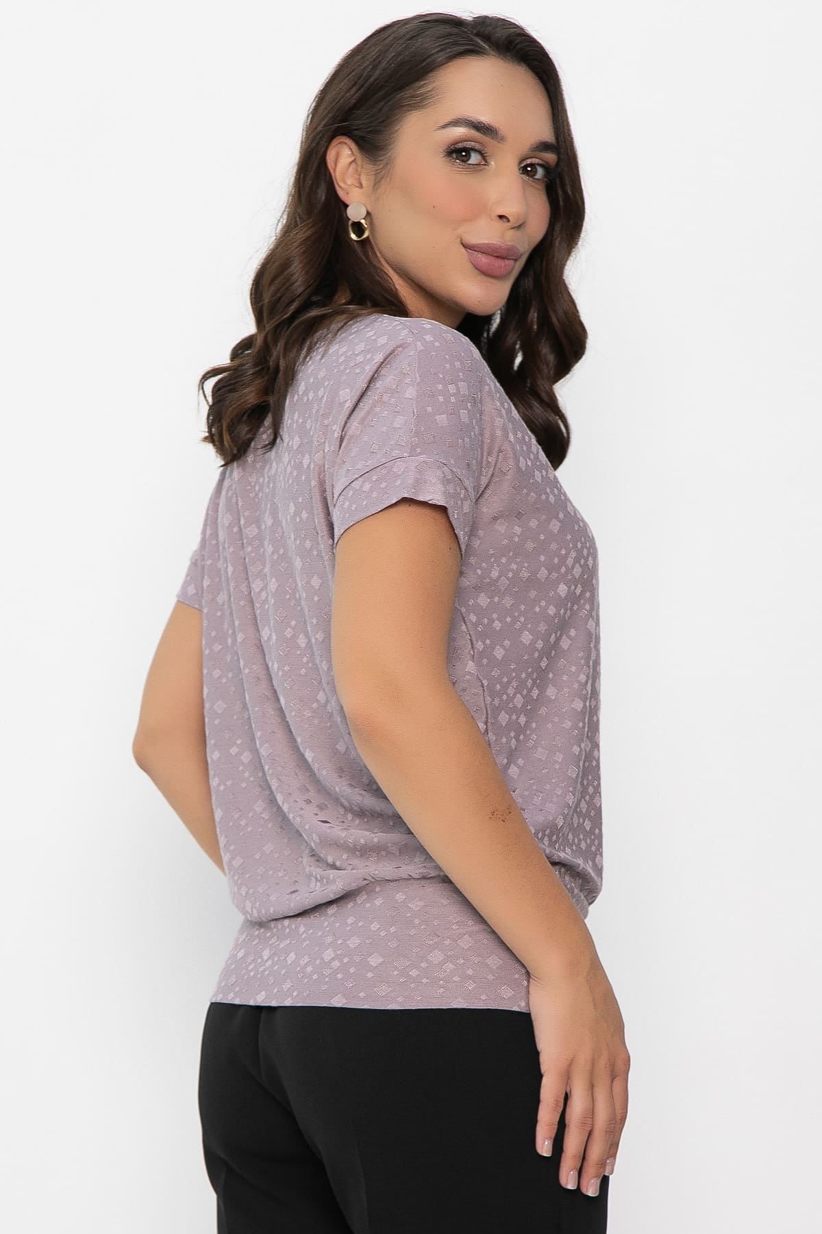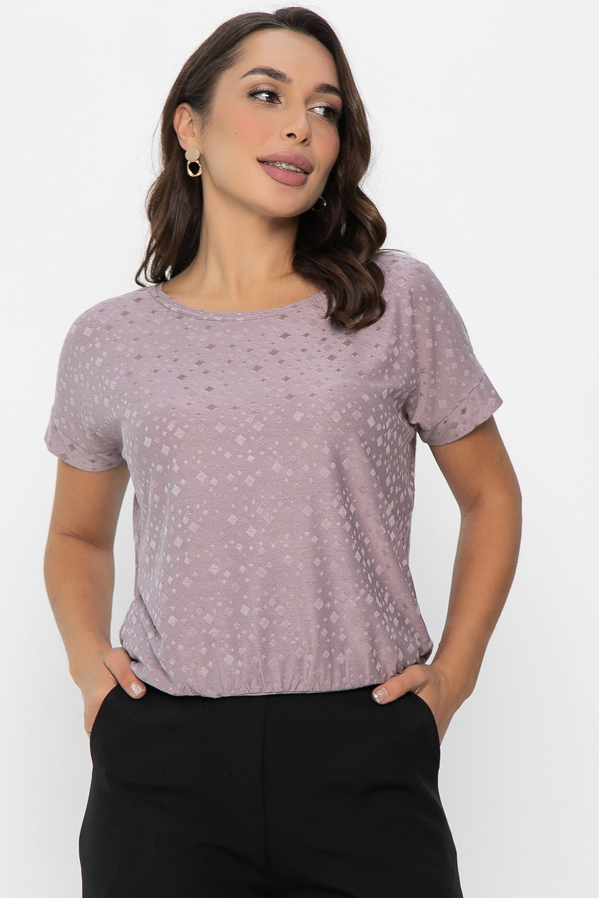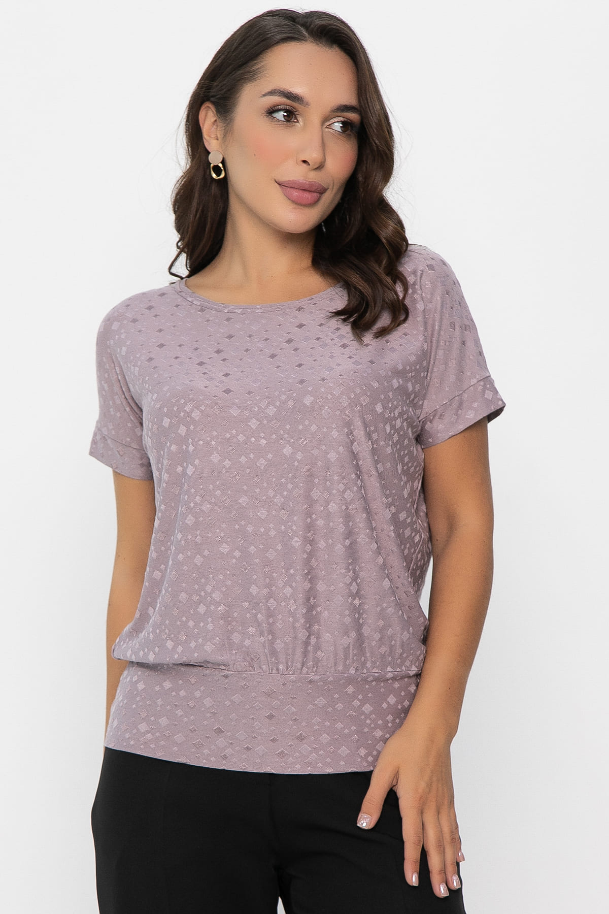 Встречайте изысканную блузку в светло-сиреневом оттенке. Этот элемент гардероба станет вашим универсальным спутником. Свободный крой обеспечивает удобство и свободу движений, а круглый вырез добавляет образу элегантности. Спущенный рукав с притачной манжетой придает модели особый шарм. Низ блузы на широкой ножке.