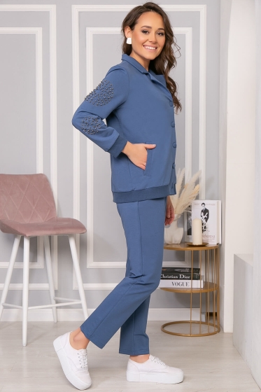Костюм-двойка, состоящий из брюк и жакета. Брюки по талии на резинке, слегка заужены книзу. Жакет по переду застёгивается на пуговицы, рукава украшены серебристыми бусинами с надёжными креплениями. Такой костюм может быть быть использован для создания повседневного или делового образа.
