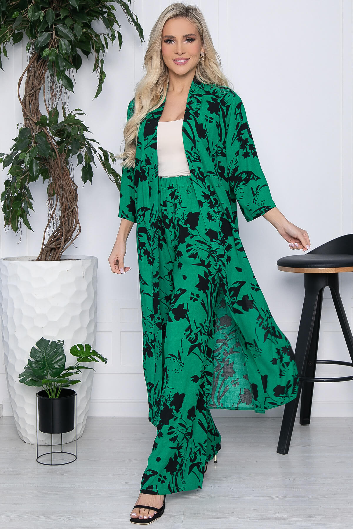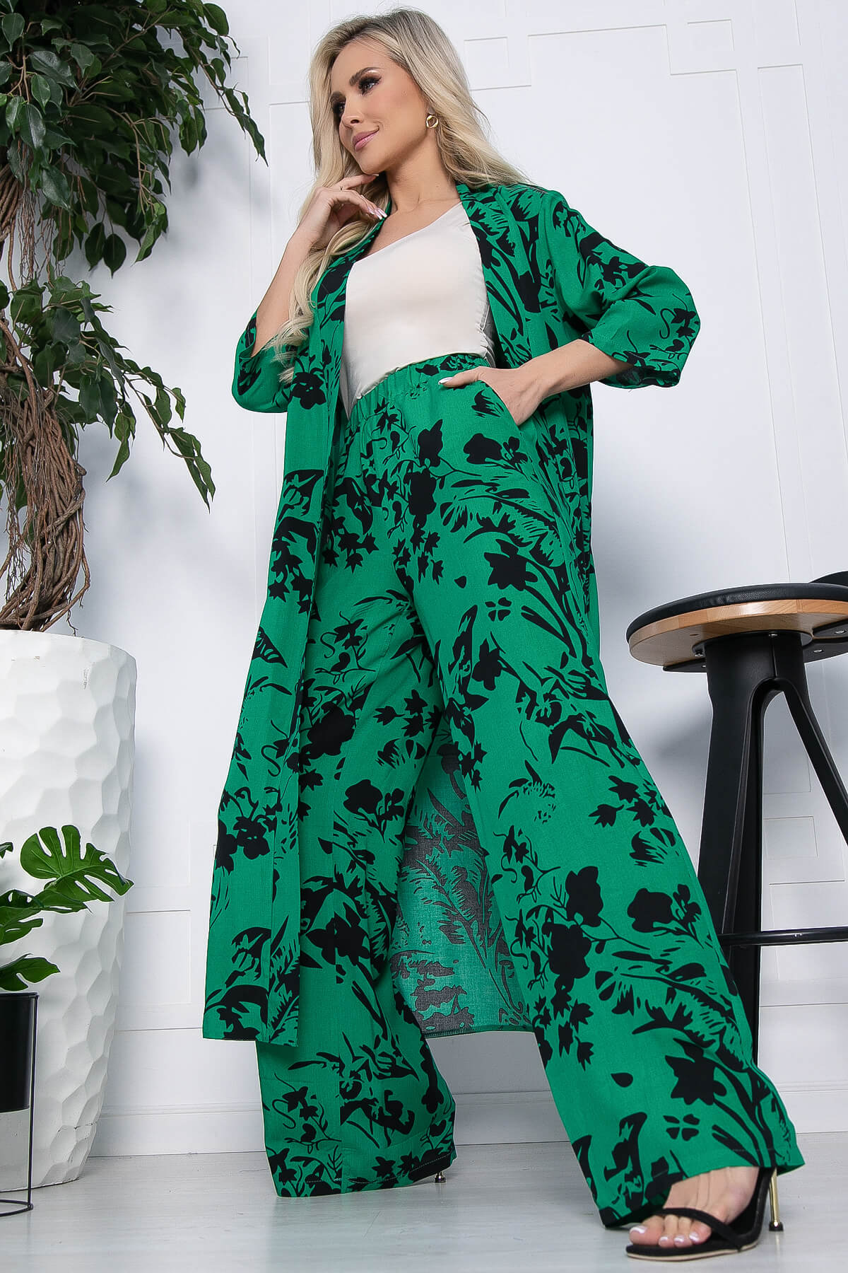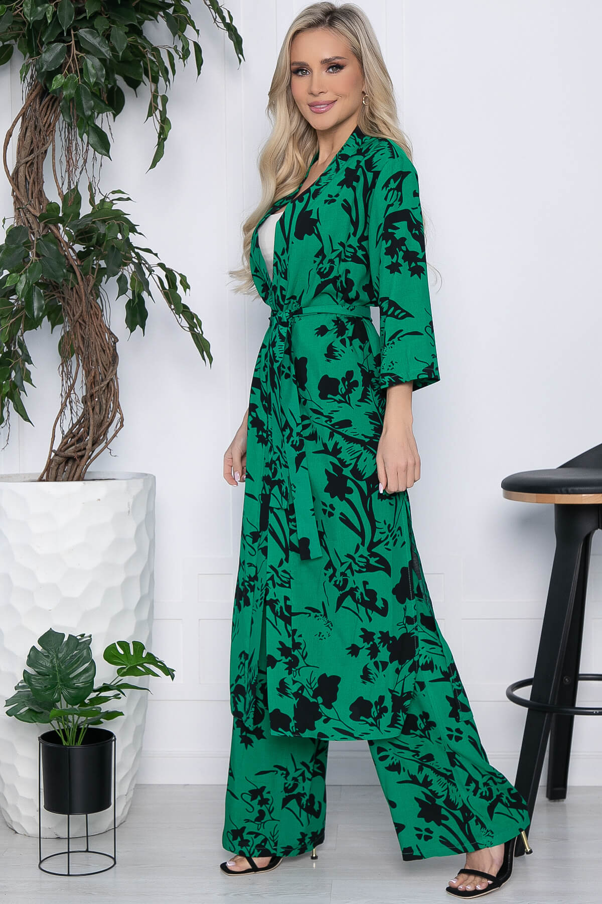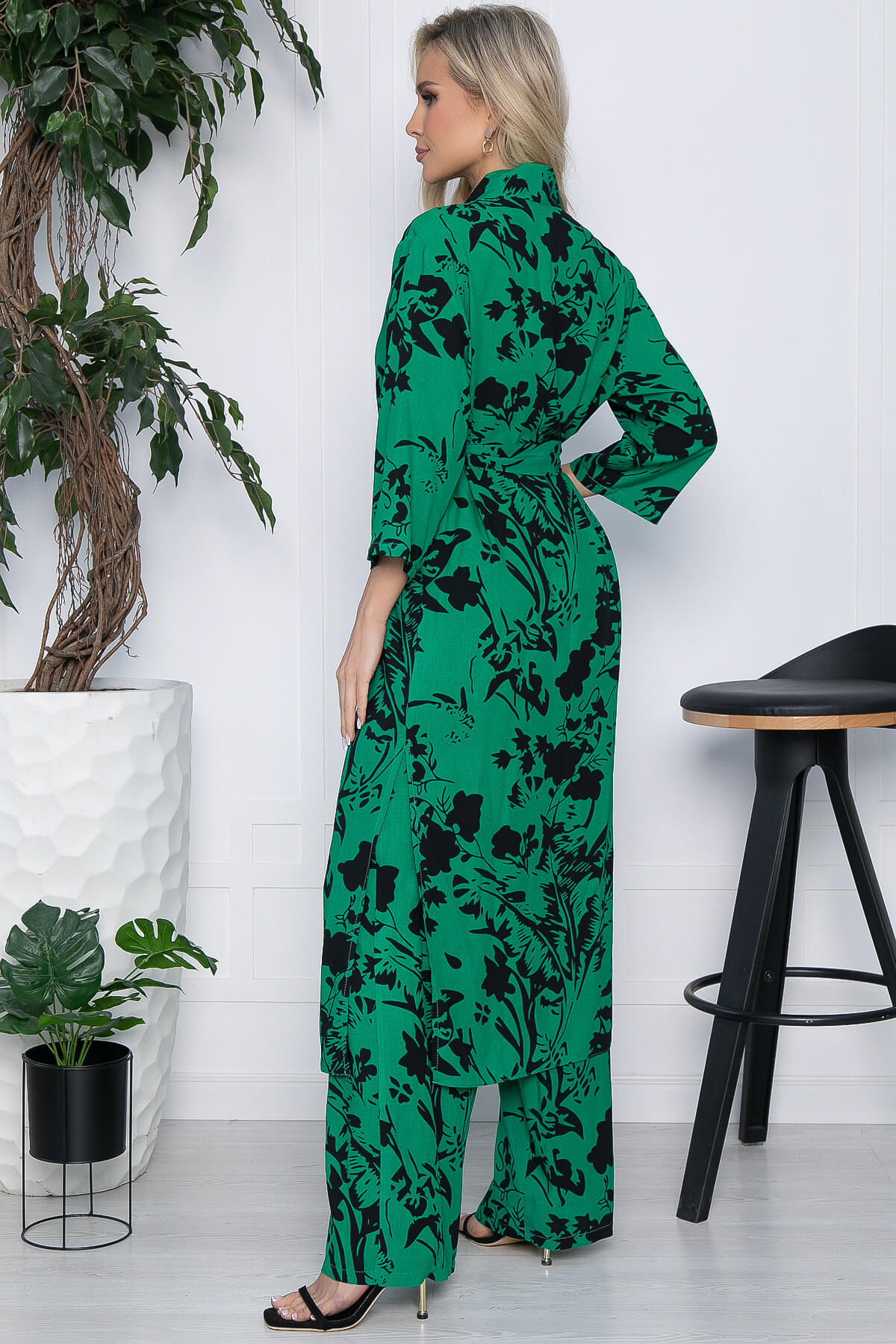 Костюм из лёгкой ткани идеально подойдёт для летнего расслабленного образа. Свободный крой не сковывает движений и дарит комфорт. В комплект входит пояс из основной ткани, который позволит подчеркнуть преимущества фигуры.