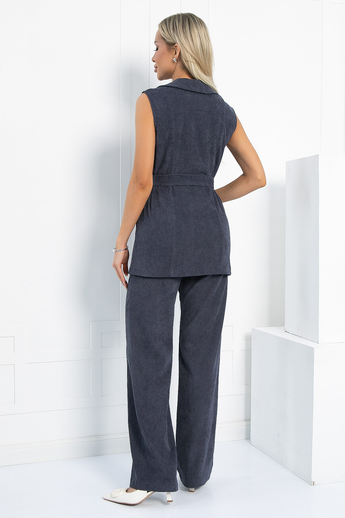 Стильный костюм из жилета и брюк идеально будет смотреться, как в повседневной жизни, так и на деловой встрече. Жилет можно дополнить поясом из основной ткани, который идет в комплекте. С поясом образ получится более утонченный. Жилет без подкладки и без карманов. Оригинальный отложной воротник добавляет элегантности образу. Брюки классические по талии на резинке.