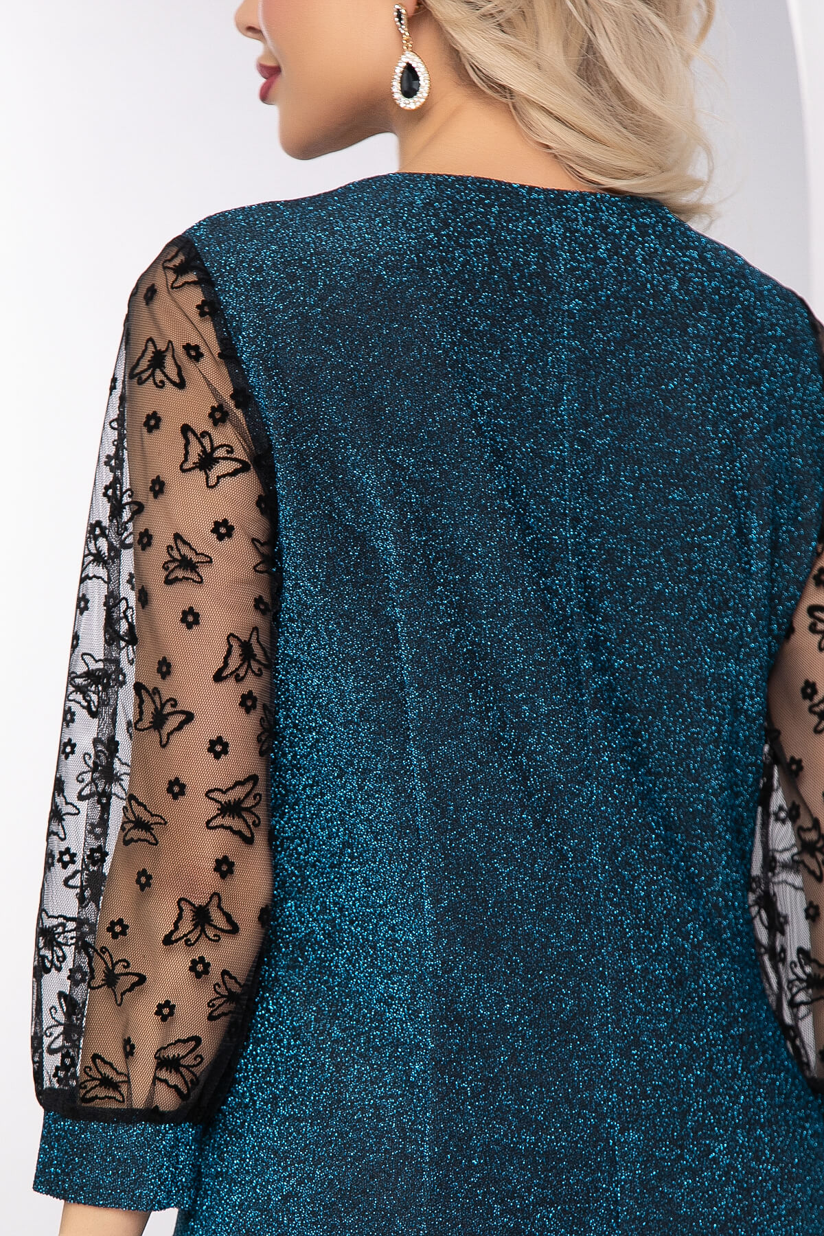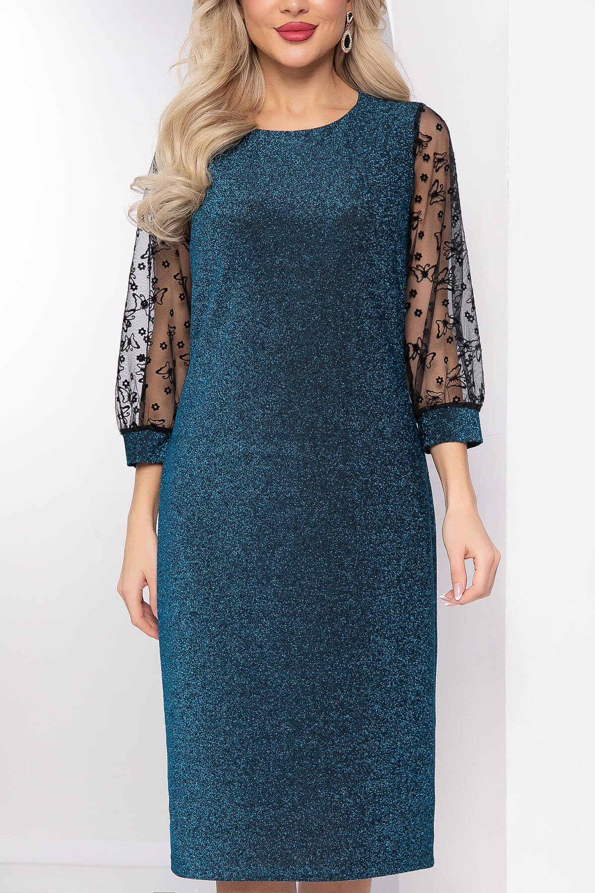 Женственное, манящее, притягивающее взгляды вечернее платье с легкими и воздушными рукавами. Рукава выполнены из сетки с декоративным принтом, по низу манжет из основной ткани. Мерцающее платье - отличный вариант на праздничный вечер!