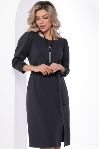 Стильное и элегантное платье полуприлегающего силуэта украсит гардероб самой требовательной модницы. Строгий графитовый цвет и четкие линии придают изделию модный акцент. Вырез карэ является безусловным достоинством данной модели, а выразительный разрез по ножке сделает Ваш образ особенно эффектным. Рукава средней длины на манжете имеют аккуратную, но выразительную сборку сверху. Завершает приятное впечатление о модели красивый длинный пояс.