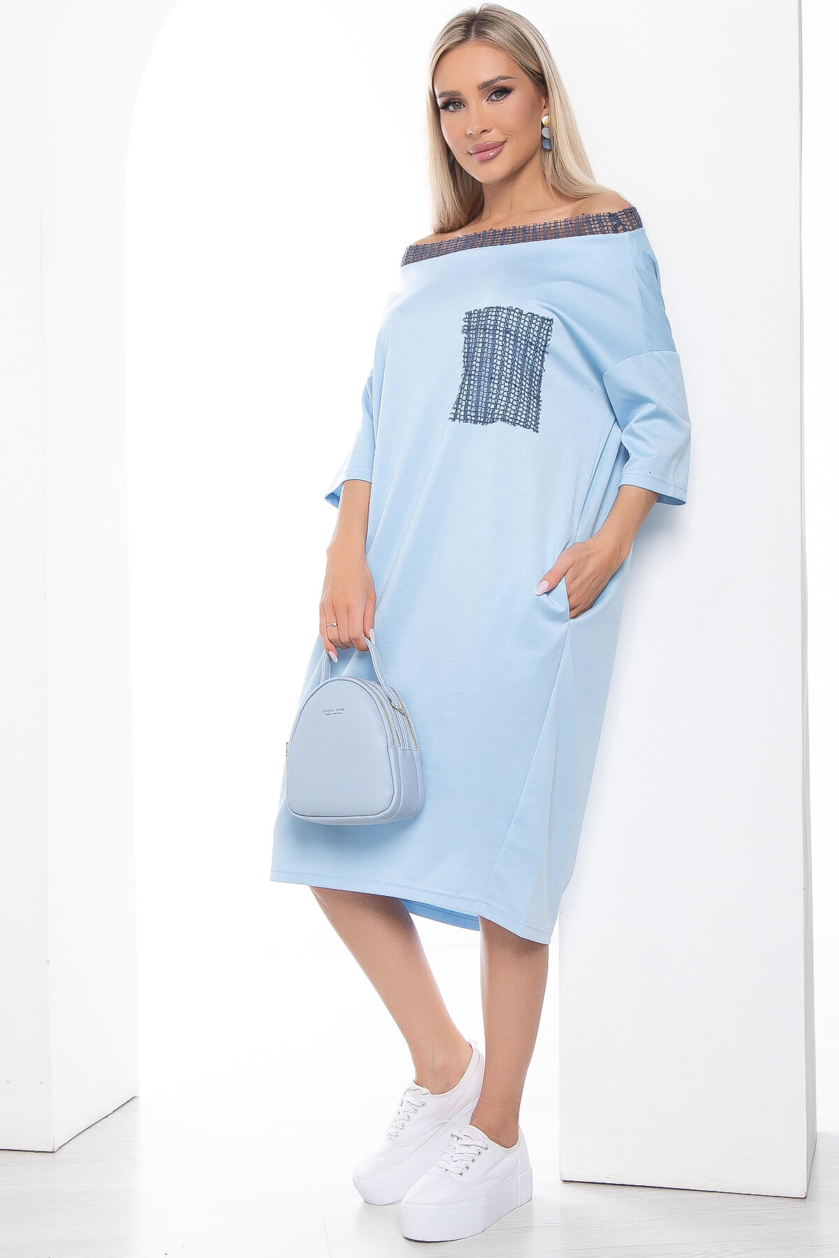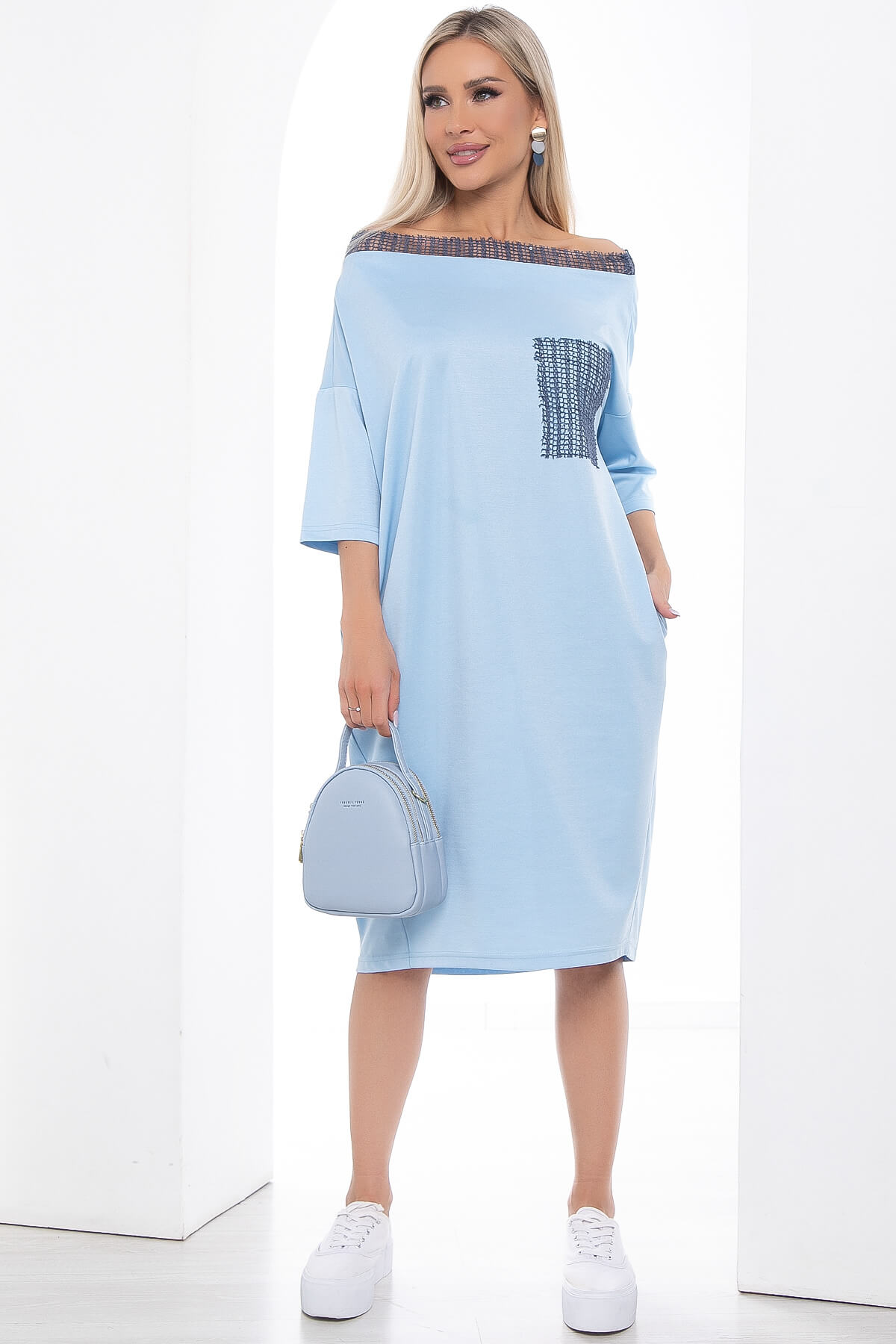 Модное трикотажное платье небесно голубого цвета – это базовый предмет женской одежды, который можно дополнить аксессуарами и создать множество различных образов. Оно универсальное, подойдет к вечернему образу на корпоратив, в качестве классического делового наряда или офисного повседневного варианта на работу, а так же на последний звонок, выпускной. Платье свободного кроя доступно в больших размерах, чтобы соответствовать потребностям каждой женщины.