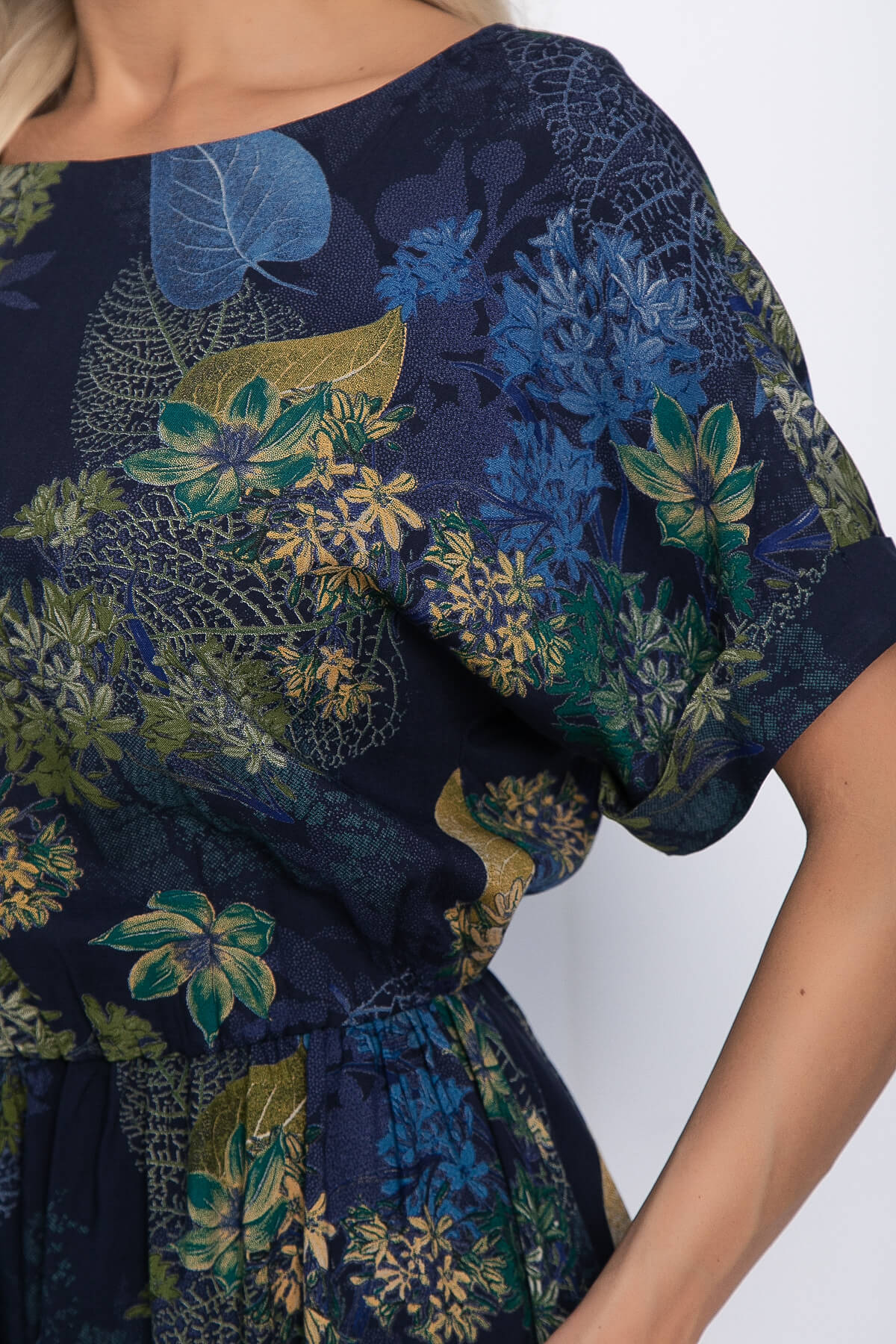 Элегантное, женственное платье с цветным рисунком, талия на резинке, с поясом в комплекте, сзади V - образный вырез с планкой.