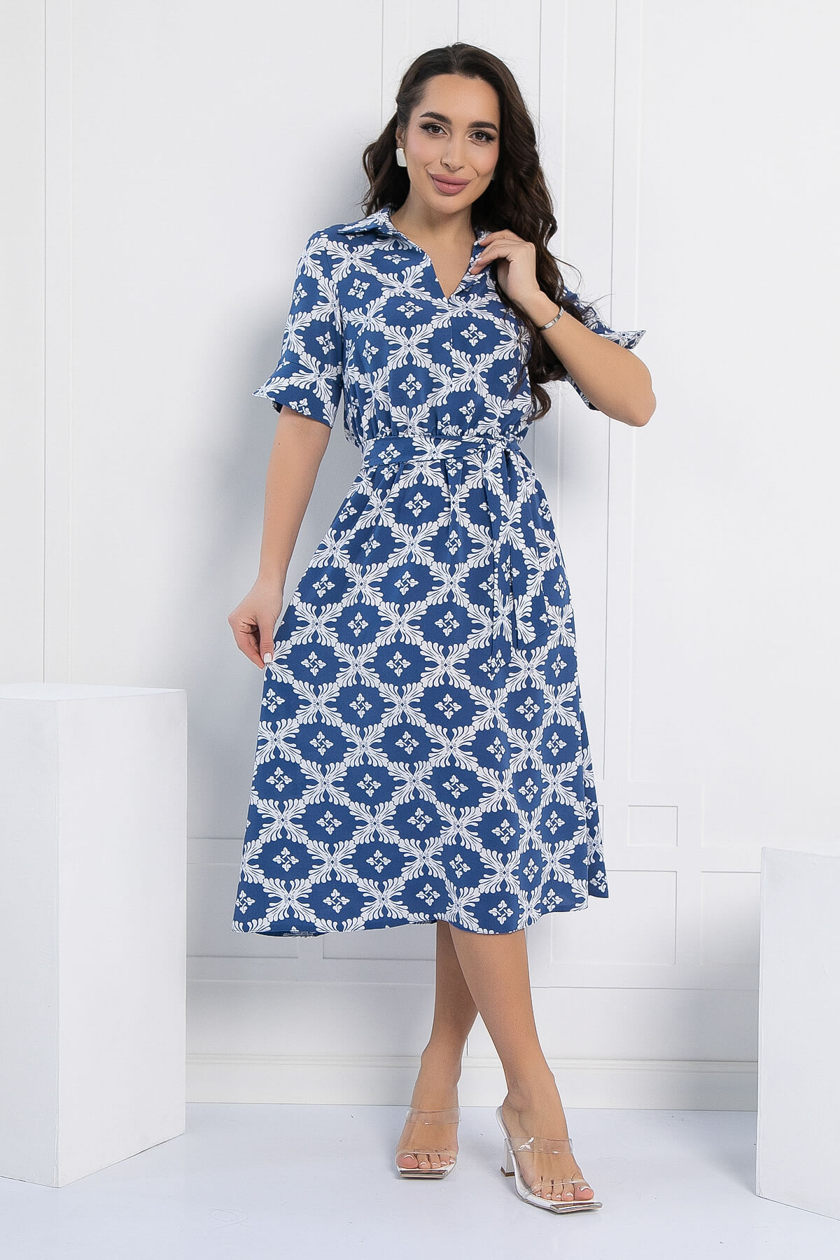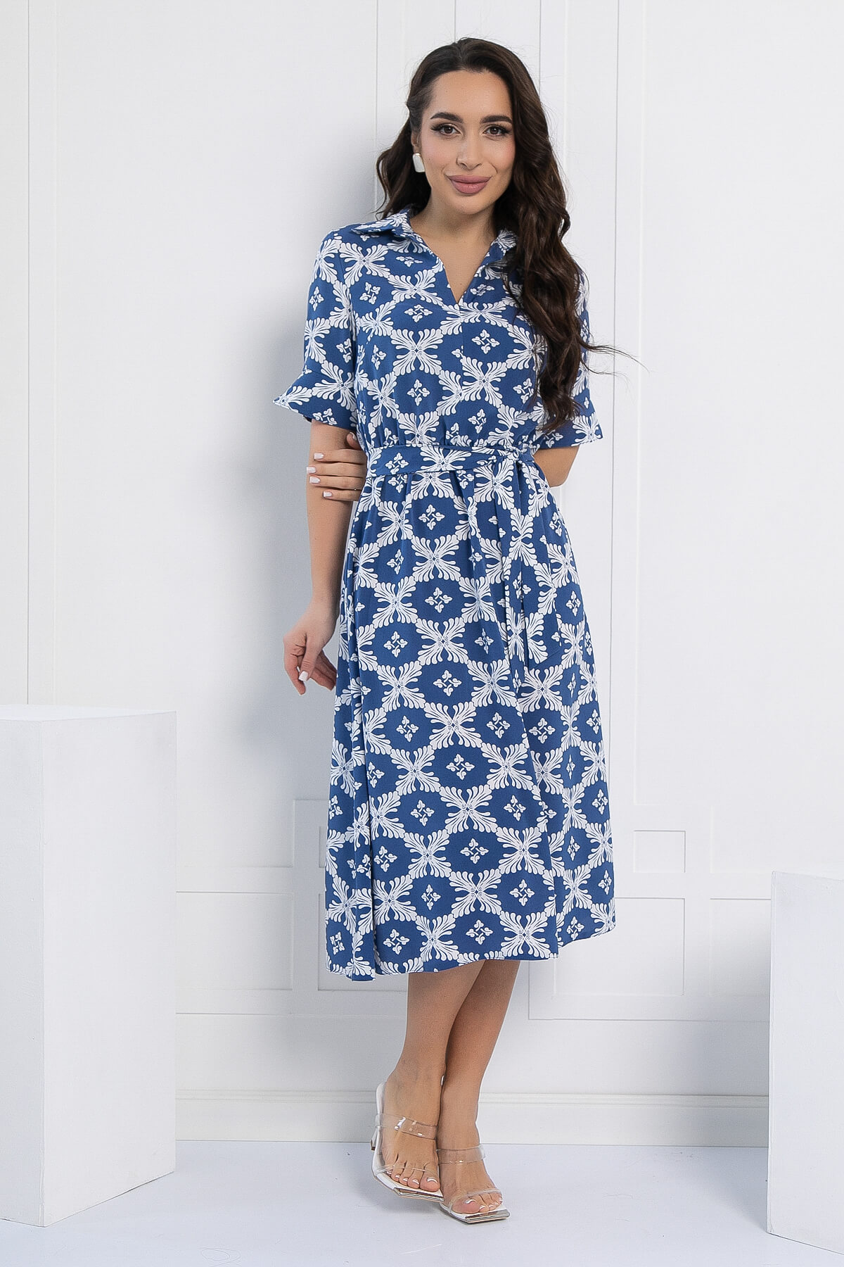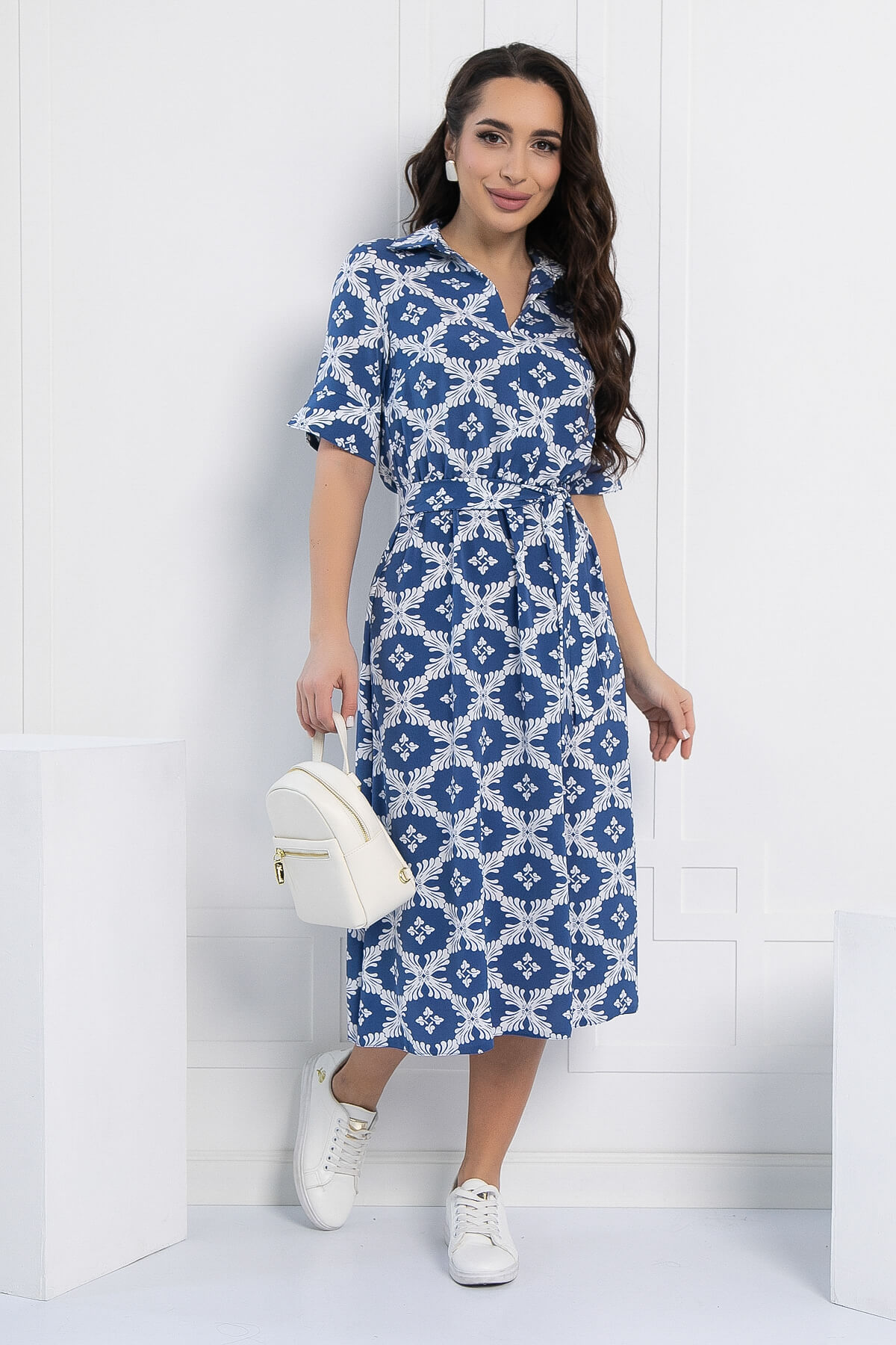 Элегантное платье средней длины станет прекрасным дополнением к вашему гардеробу. Оно отличается рубашечным воротником и рукавами три четверти на манжете, что придает ему стильный и современный вид. В комплекте с платьем идет пояс из основной ткани, который подчеркивает вашу талию и создает гармоничный силуэт. По талии резинка.
