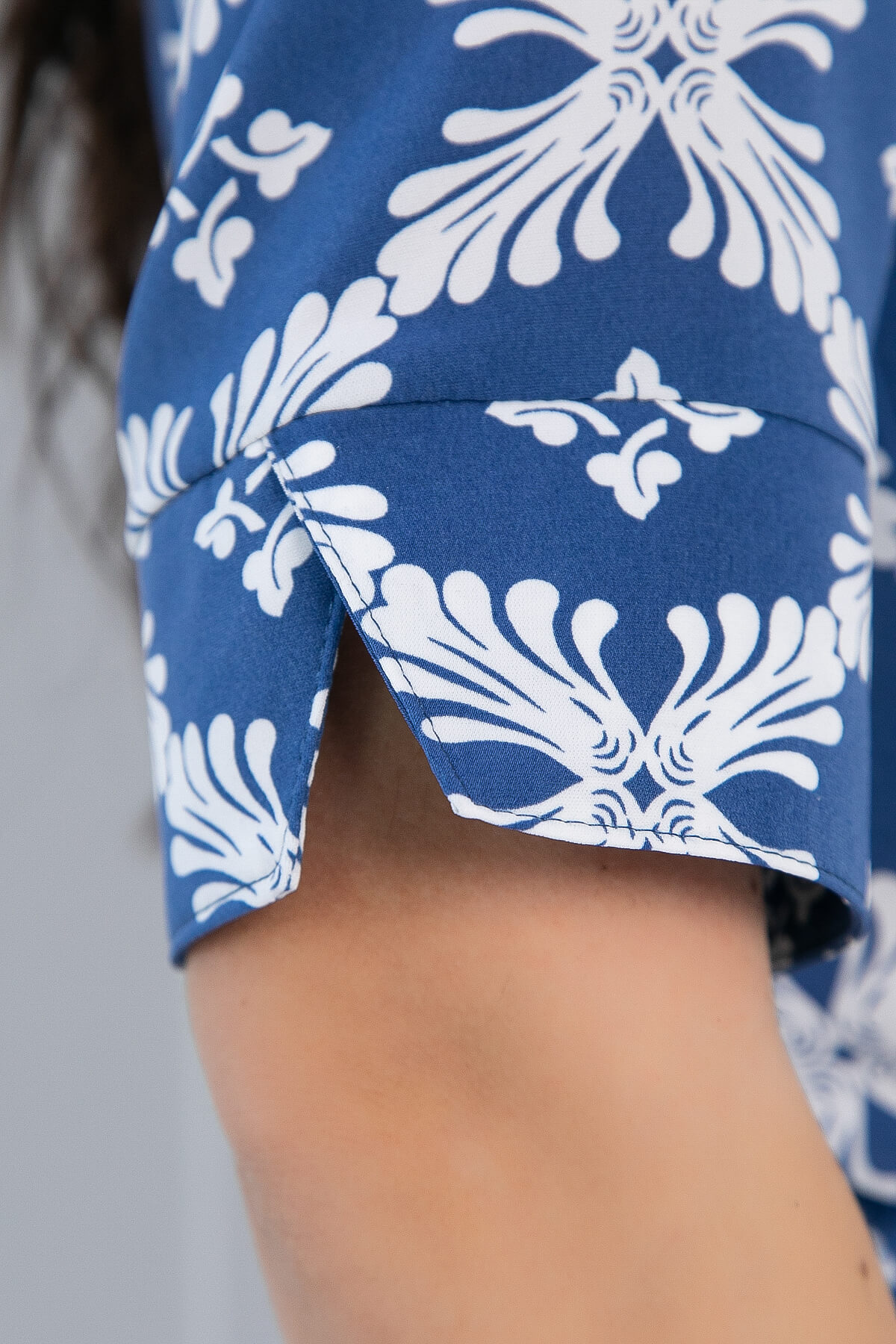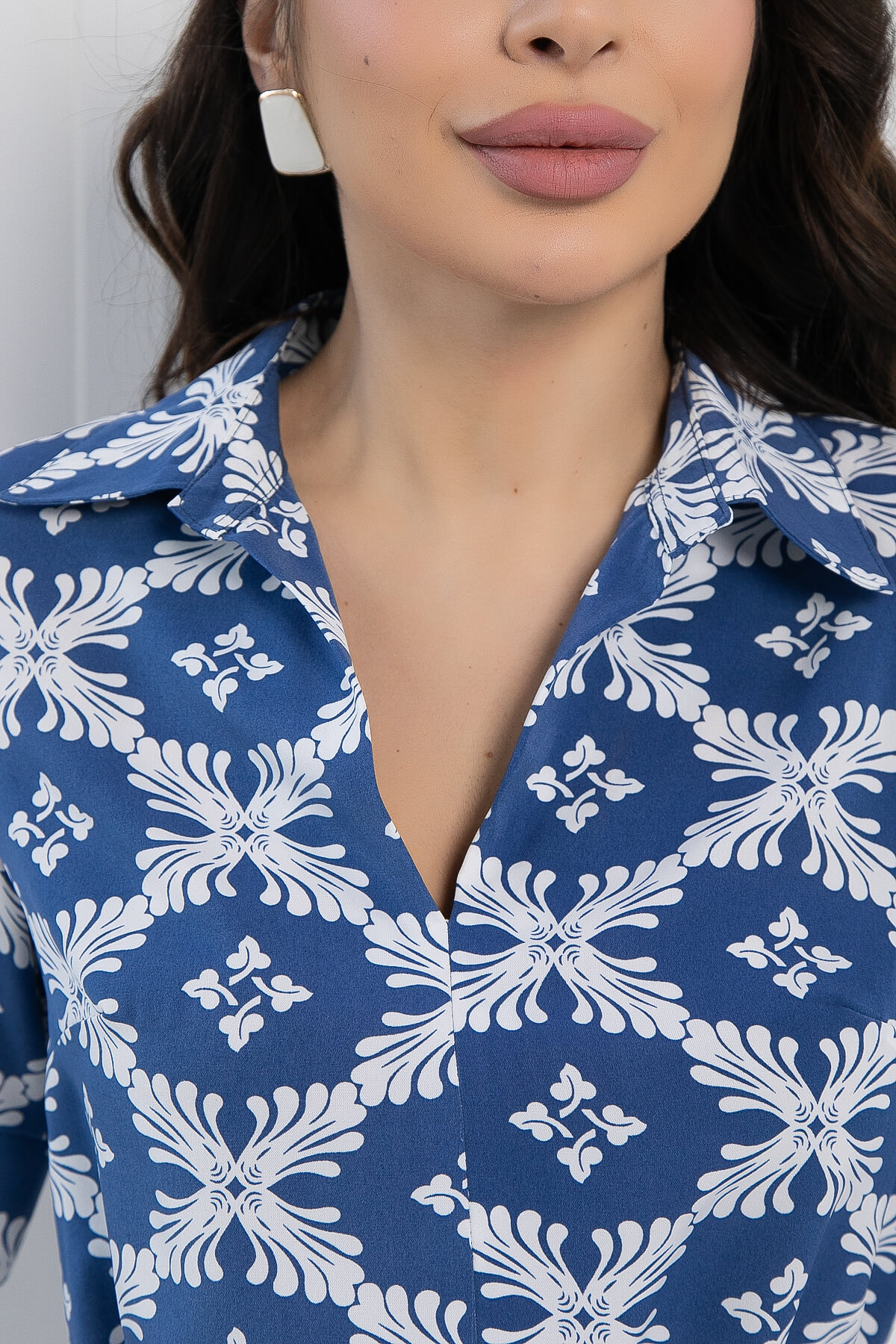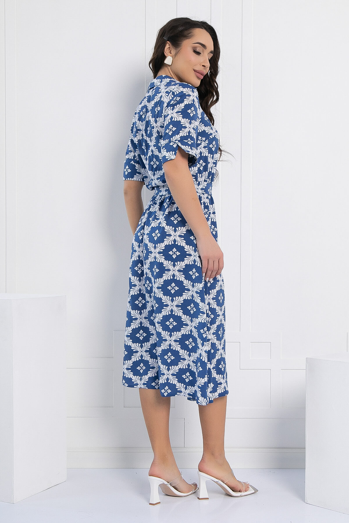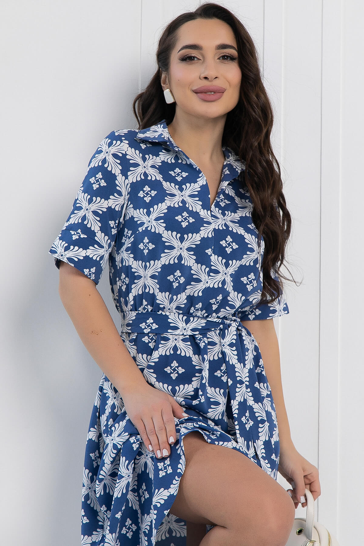Элегантное платье средней длины станет прекрасным дополнением к вашему гардеробу. Оно отличается рубашечным воротником и рукавами три четверти на манжете, что придает ему стильный и современный вид. В комплекте с платьем идет пояс из основной ткани, который подчеркивает вашу талию и создает гармоничный силуэт. По талии резинка.
