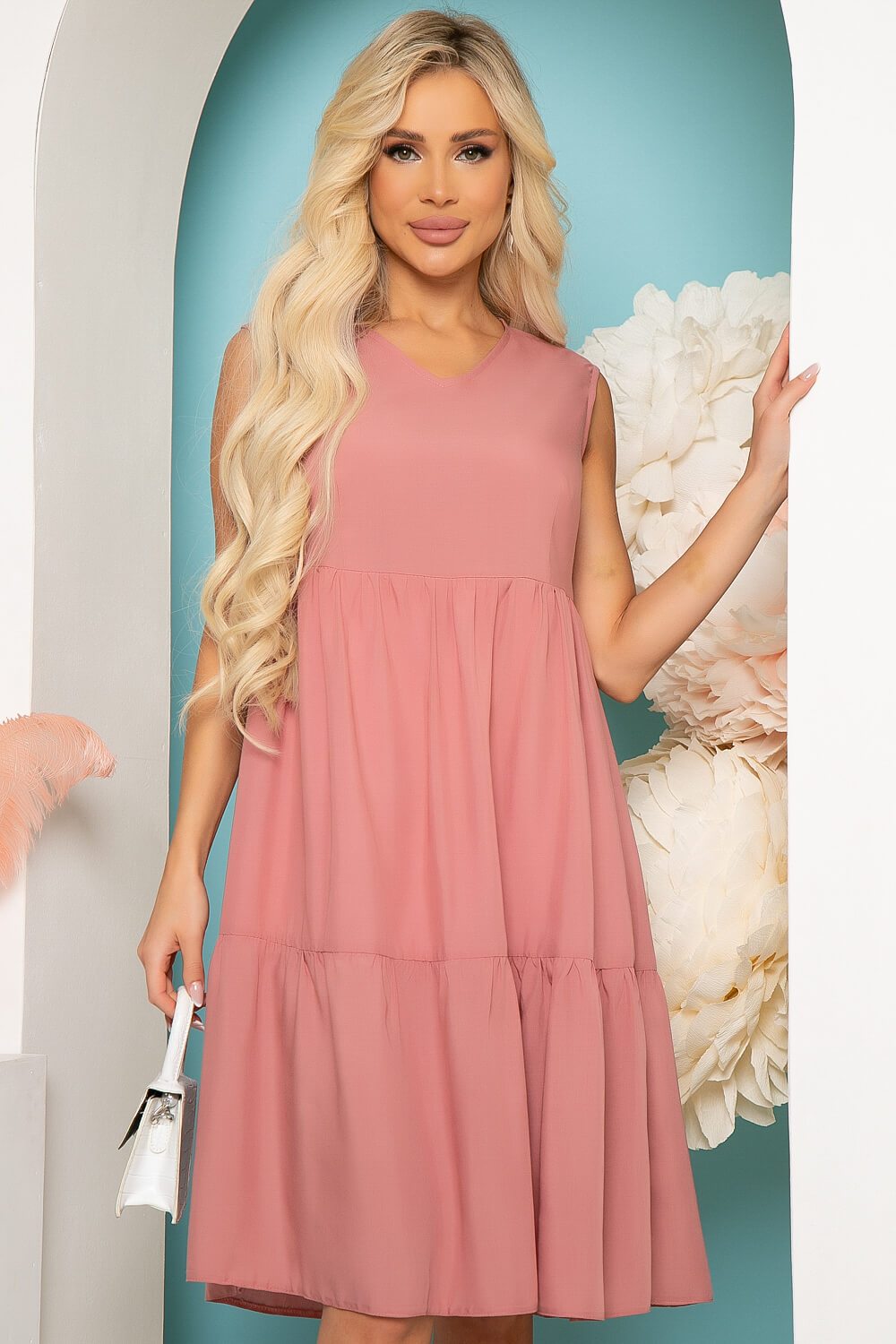 Летнее платье из штапеля с завышенной талией прекрасно справится с задачей скрыть небольшие изъяны фигуры и визуально придать ей большую стройность. Юбка состоит из широких воланов. Платье без рукавов, V-образный вырез горловины.