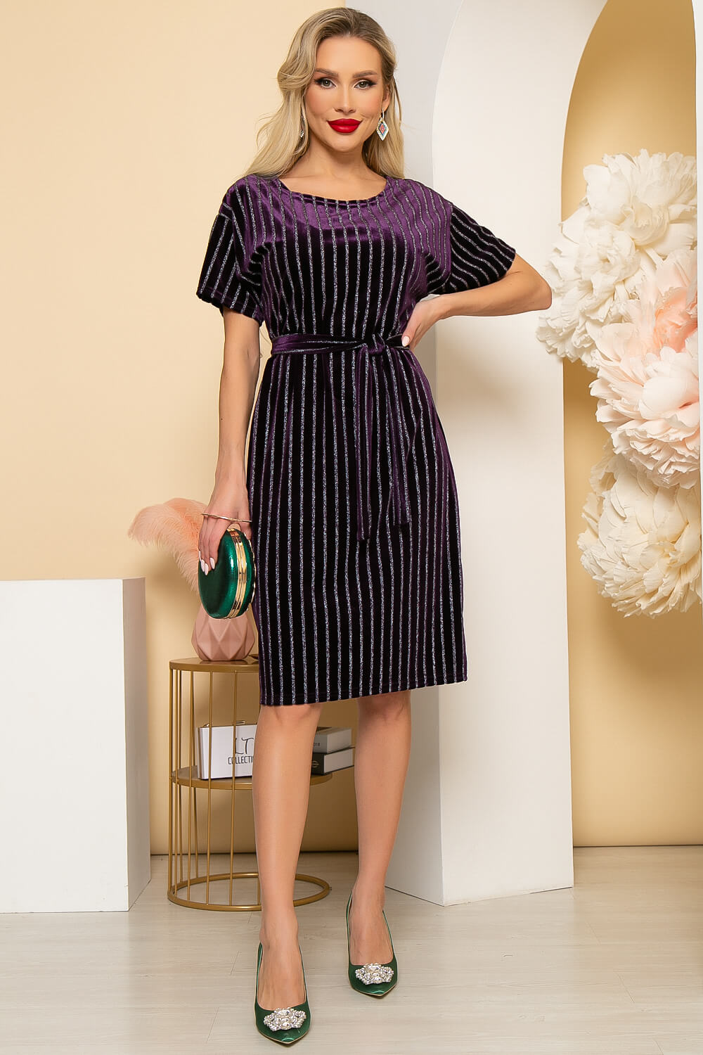 Эффектное платье полуприлегающего силуэта выполнено из мягкого велюрового полотна. Вертикальные полосы на ткани стройнят и вытягивают силуэт. Линия плеча спущена,в комплекте пояс из основной ткани, при помощи которого можно подчеркнуть талию.